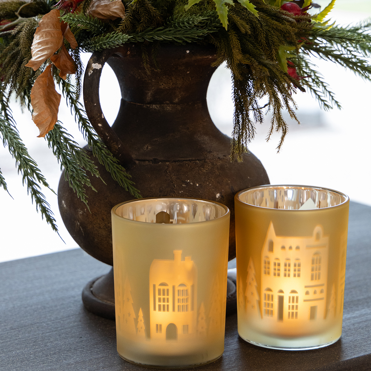 Farol de cristal plateado dorado con silueta de ciudad H12,5cm 4 uds