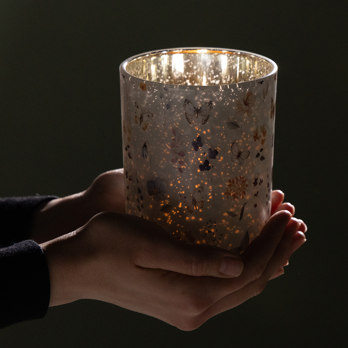 Este candelabro es realmente llamativo. Con 8 cm de alto y 7 cm de diámetro, tiene el tamaño perfecto para difundir una luz suave sin resultar abrumadora. El delicado motivo de mariposa en el cristal, combinado con la superficie reflectante plateada interior, crea un mágico juego de luces y sombras cuando se enciende una vela en su interior. Aporta un toque de elegancia tanto a espacios interiores como exteriores.