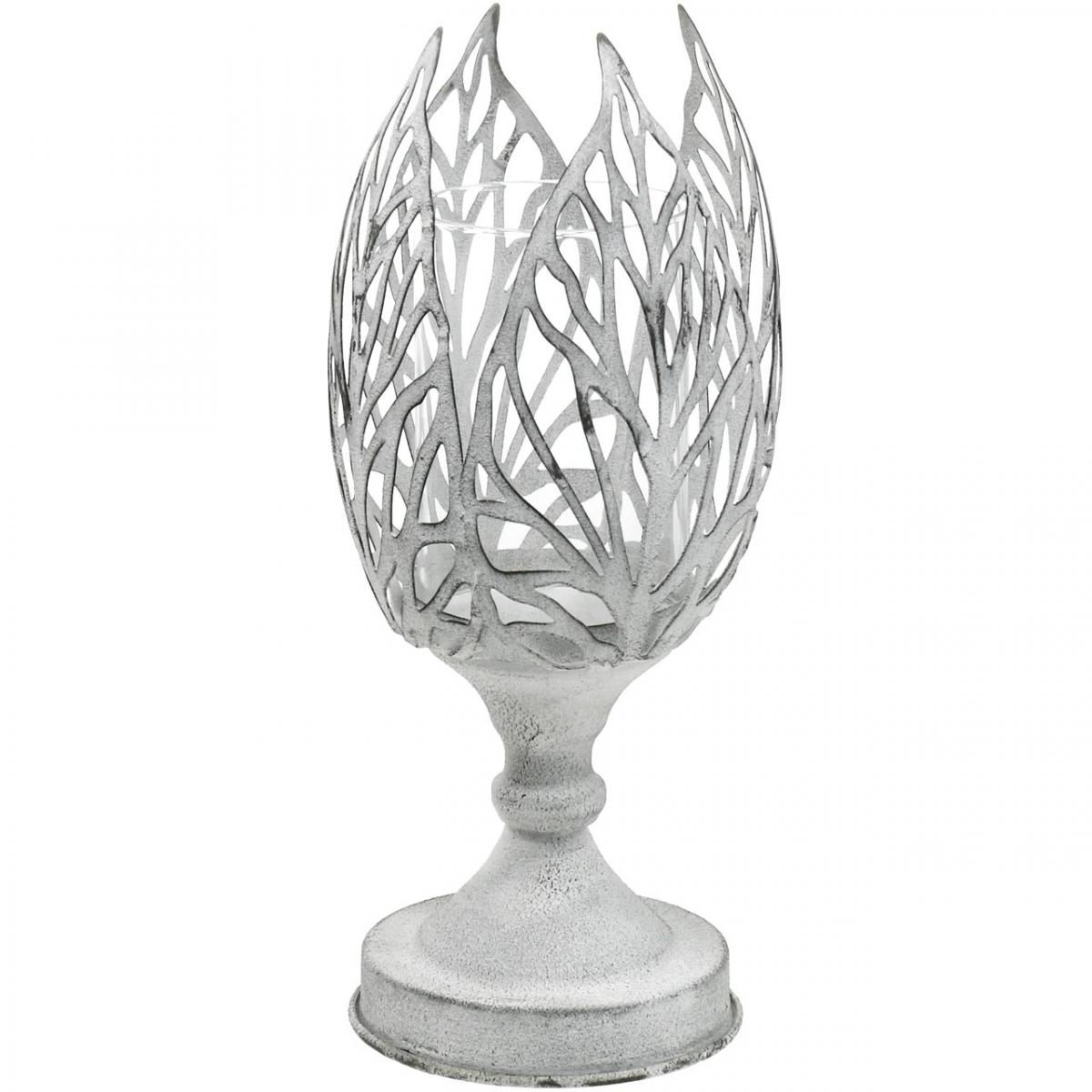 Esta atractiva decoración de metal tiene forma de flor que se abre. De color blanco lavado, en un moderno estilo shabby chic, el farol encaja en cualquier mesa festiva, en el balcón o en la terraza. La linterna está equipada con un cristal sin fondo que se puede quitar fácilmente para limpiarlo y volver a colocarlo antes de usarlo.En el vaso se pueden colocar velas de té y velas con un diámetro de unos 7 centímetros. La vela se sostiene en el cáliz por un casquillo. Por lo tanto, el cilindro de vidrio sirve como un cortavientos clásico. La copa bien formada se lleva en forma de flor sobre una base igualmente elegante.