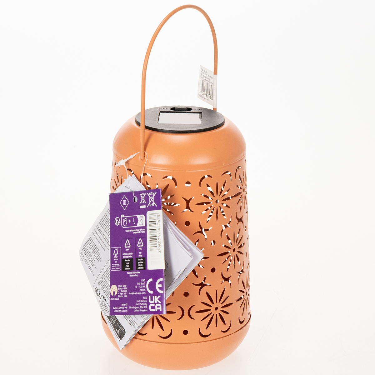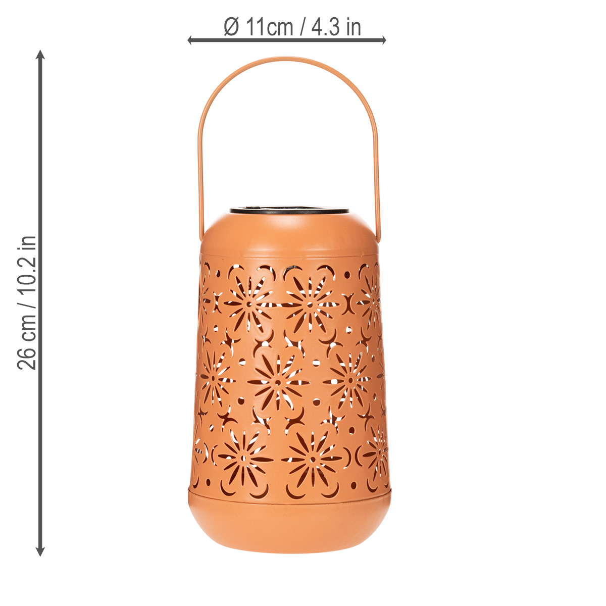 Con su cálida luz y su estampado floral, esta linterna solar crea un ambiente acogedor en cualquier espacio exterior. Los delicados diseños florales aportan al jardín un toque de elegancia y un toque bohemio. Su artesanía de alta calidad en un sutil tono naranja armoniza a la perfección con estilos de jardín modernos y clásicos. Ya sea que desee crear románticos toques de iluminación en las cálidas tardes de verano, decorar su patio con una iluminación elegante o buscar una solución decorativa para una fiesta en el jardín, esta lámpara solar de exterior es más que una simple fuente de luz. Es un elemento destacado en cualquier espacio exterior.