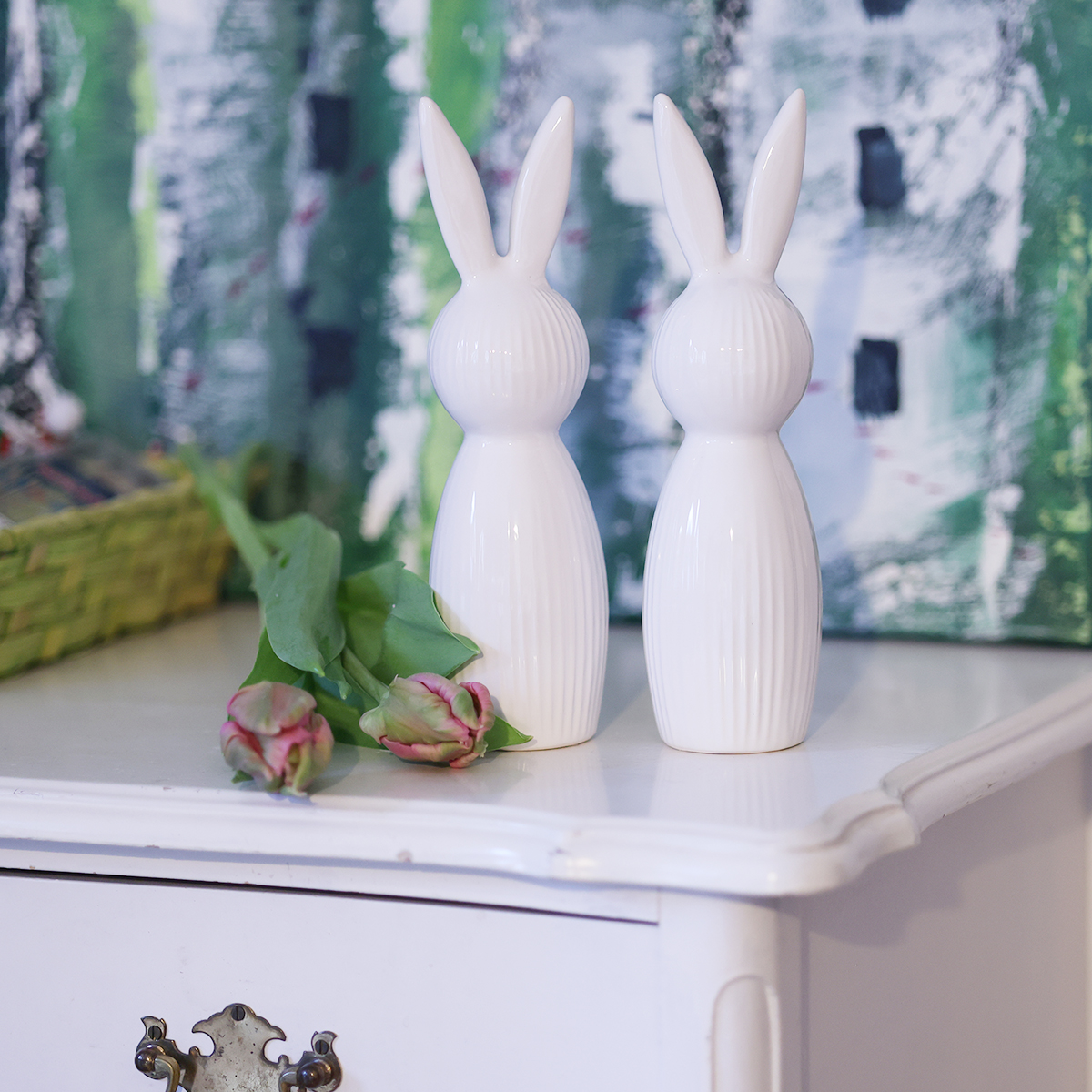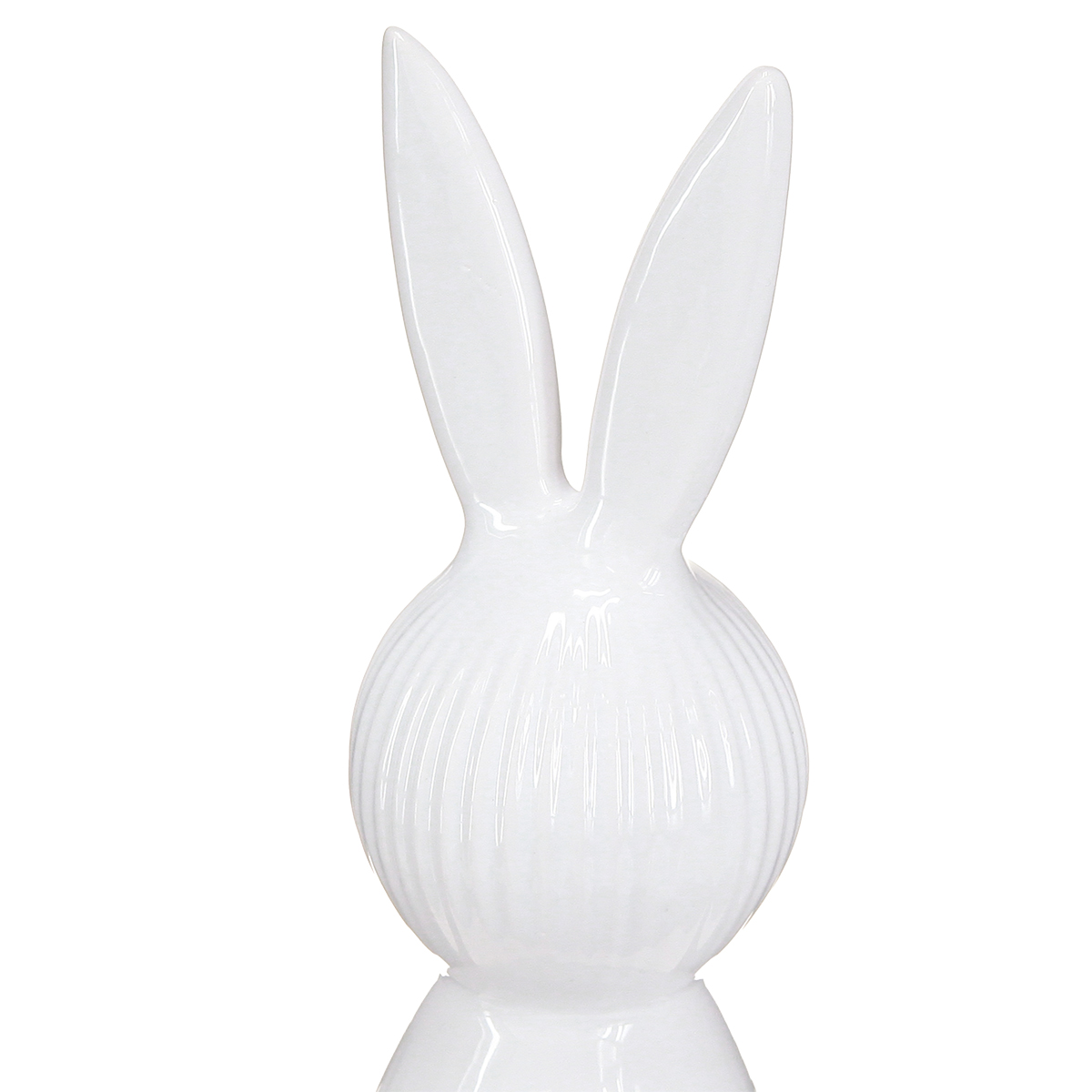 Esta sencilla figura de conejo, elaborada en cerámica de alta calidad, se distingue por su combinación única de diseño minimalista y funcionalidad. Su superficie brillante le confiere una profundidad y un brillo especiales, convirtiéndola al instante en el centro de atención de tu decoración. Son perfectas para la decoración de primavera y Pascua, ya sea en la mesa de Pascua, en un moderno ramo de Pascua o como un sutil punto de atracción en tu recepción. Su altura de 22 cm logra el equilibrio perfecto entre presencia y elegancia discreta. Su superficie ligeramente acanalada la convierte en un deleite tanto para la vista como para el tacto. Quienes aprecian la elegancia discreta adorarán su color blanco neutro. Combina a la perfección con casi cualquier estilo: candelabros de cristal modernos, jarrones minimalistas u otros accesorios primaverales de colores claros. ¡Exhibir estos conejos decorativos individualmente o en pareja depende totalmente de tu creatividad! Un pequeño consejo: complementa las figuras con otros elementos decorativos de cerámica blanca o combínalas con toques de color pastel para crear acentos armoniosos y lograr una decoración primaveral de éxito.