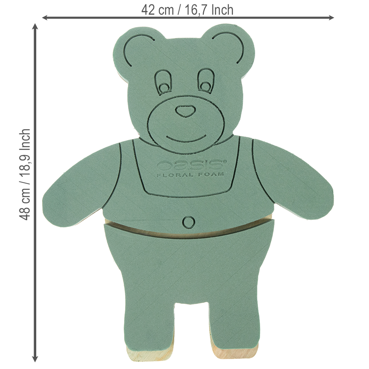 La figura de palo musgo Oasis® en forma de osito se entrega en una caja grande. El oso espuma floral mide aproximadamente 48.5 centímetros por 42 centímetros. Mide aproximadamente 5 centímetros de alto.