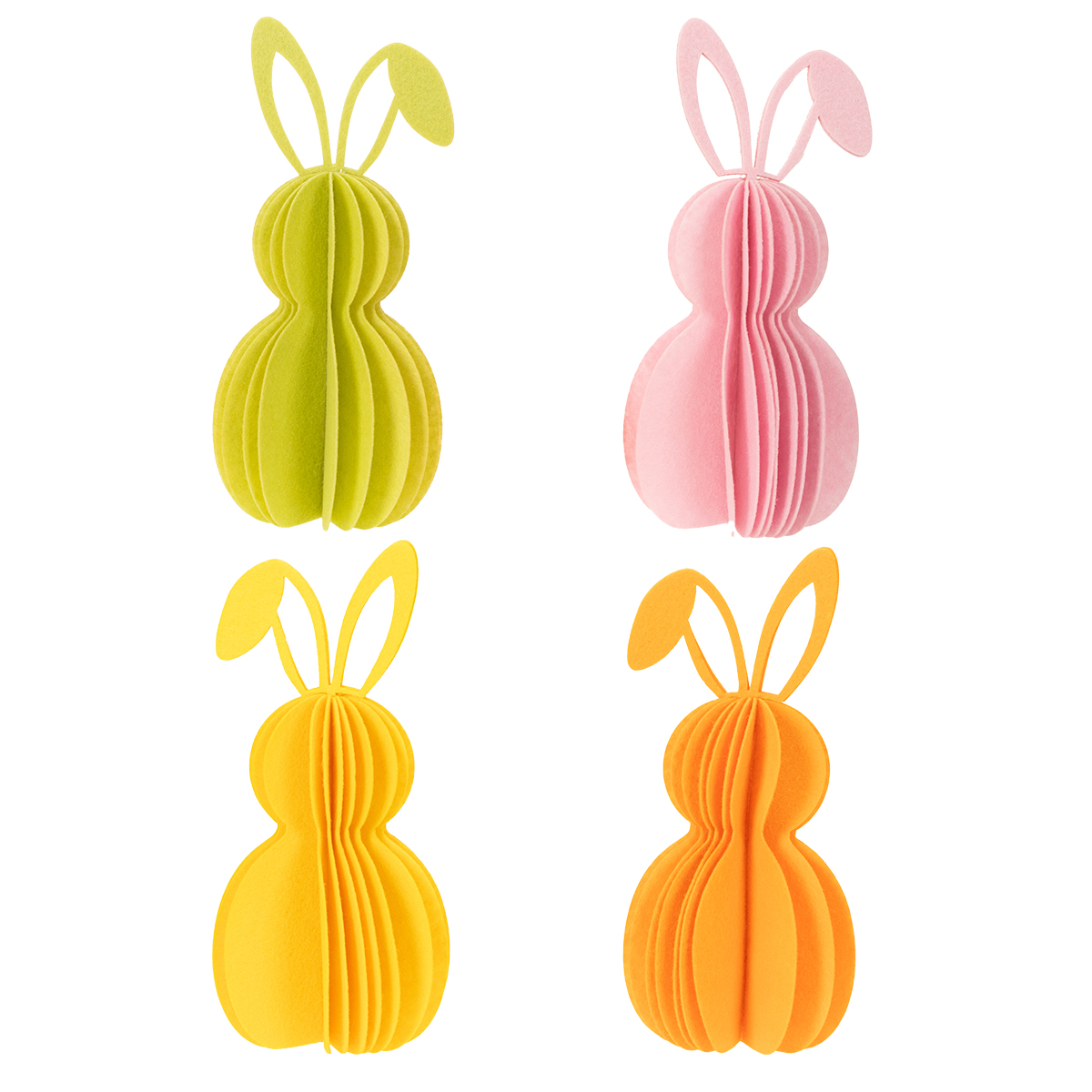 - Juego de 4 conejitos de papel decorativos en amarillo, naranja, verde y rosa.