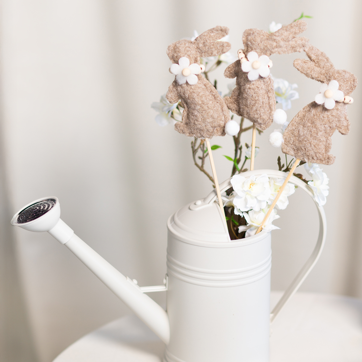 Este adorno de conejo de Pascua es una verdadera joya para los amantes de la decoración creativa. Las figuras están hechas de fieltro de alta calidad en un cálido tono marrón que irradia naturalidad y calidez. Los encantadores detalles, como la delicada flor y la pequeña cola esponjosa, les dan a los conejitos un encanto especial. Su resistente palo facilita su colocación en jarrones, macetas o arreglos florales. Quienes prefieran los diseños minimalistas o escandinavos quedarán encantados con el estilo sobrio pero expresivo de estas figuras.