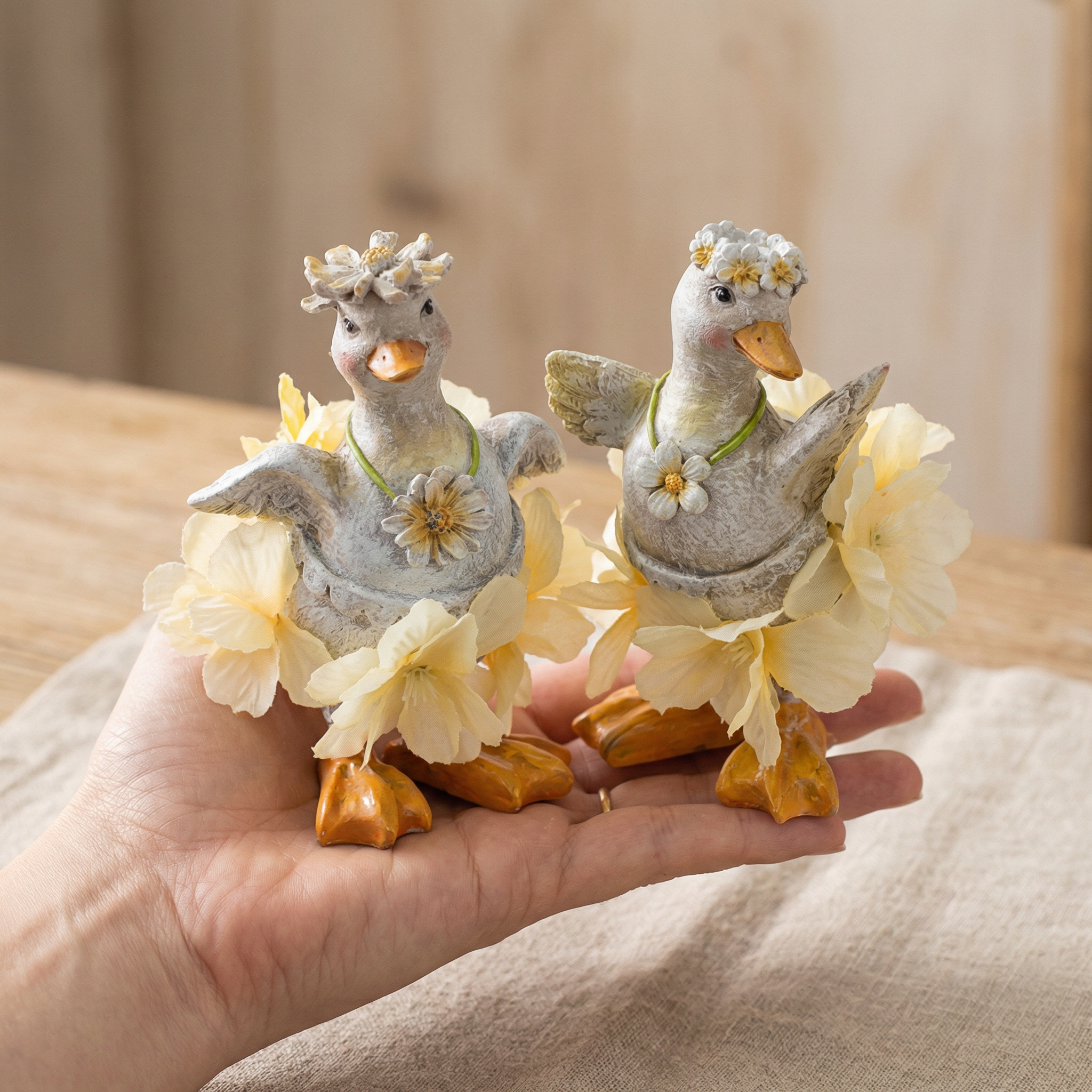 Estas encantadoras figuras de patos con vestidos florales son el centro de atención de cualquier habitación. Sus delicados estampados florales y detalles meticulosamente elaborados les confieren un encanto único. Coloca estas pequeñas obras de arte en tu escritorio para alegrar tu espacio de trabajo o úsalas para decorar una estantería en la habitación de un niño: ¡las posibilidades son infinitas!