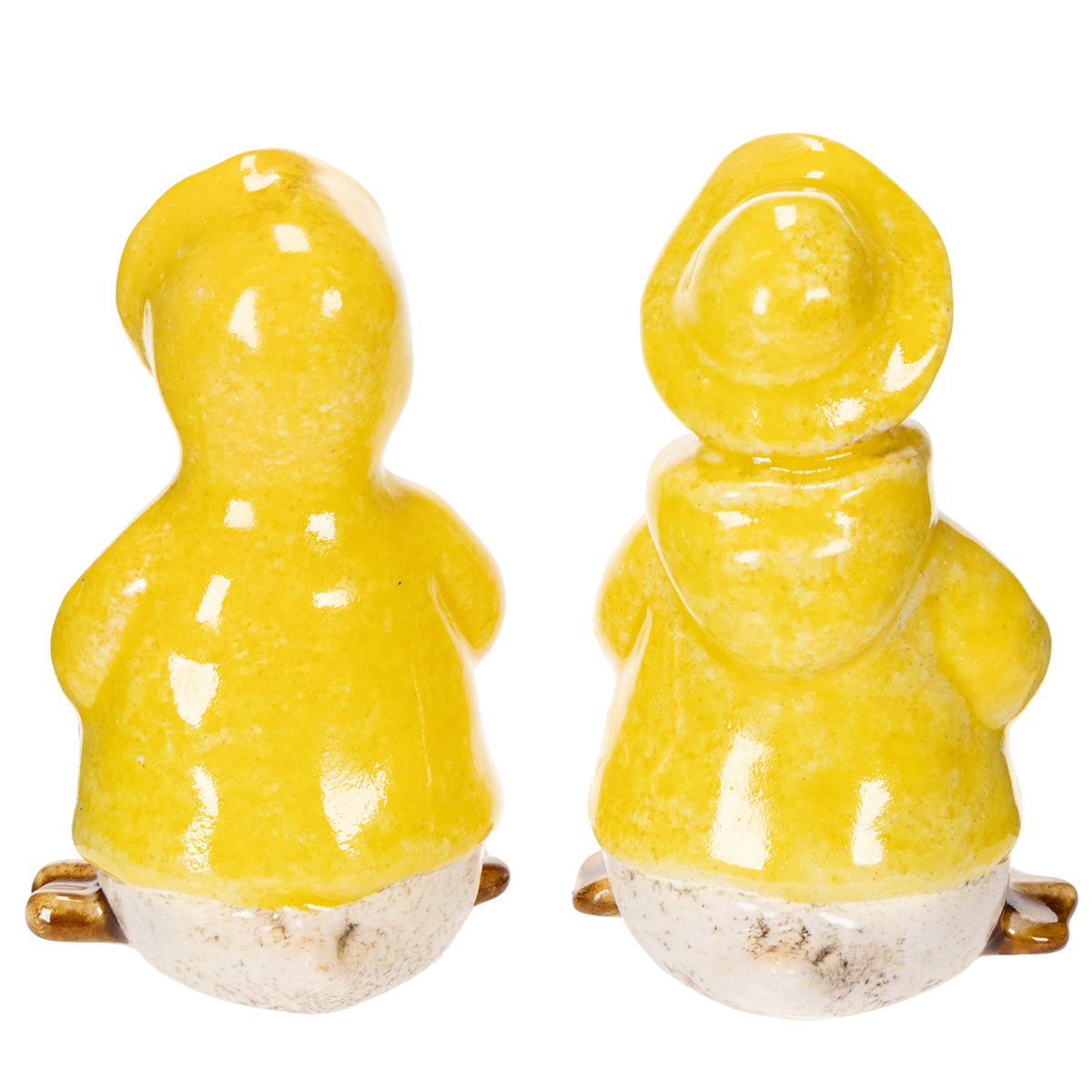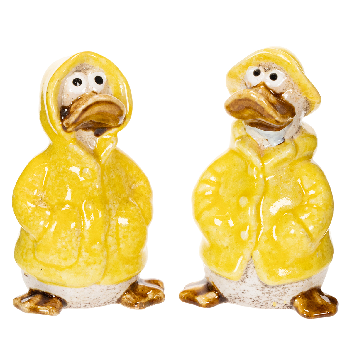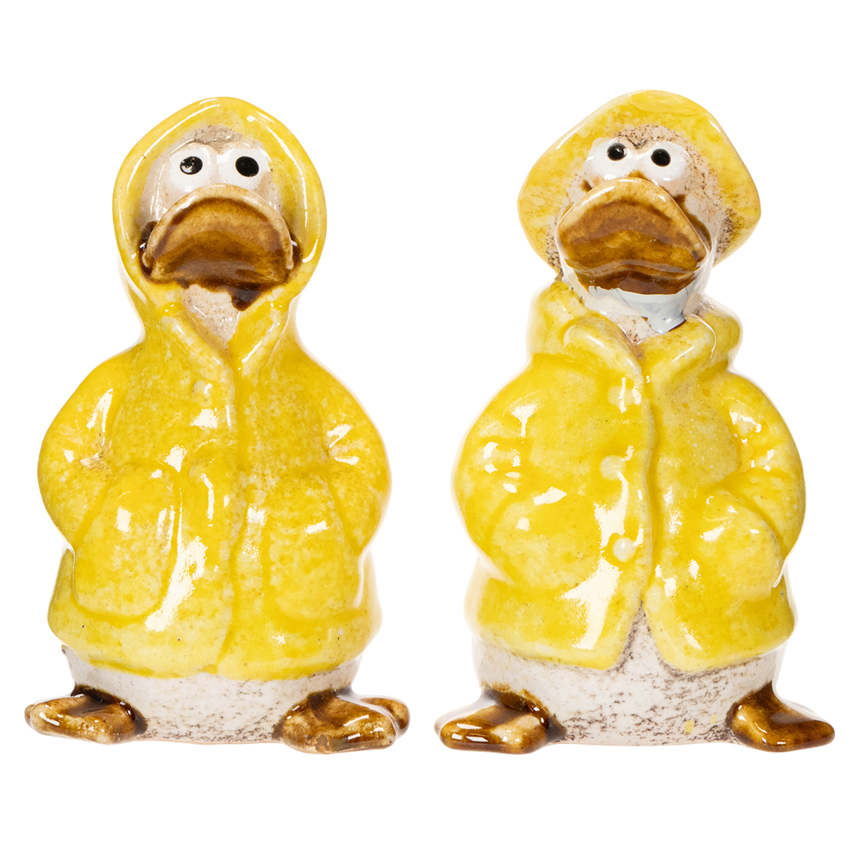 Figuras de patos de cerámica con impermeables amarillos: divertidas decoraciones de primavera y verano.