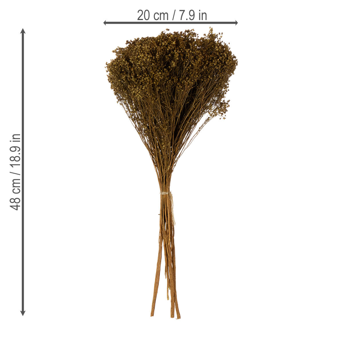 Recibirá la retama seca y teñida en un manojo de aproximadamente 150 gramos. La longitud de las ramas varía entre 40 y 48 centímetros. El diámetro del manojo es de unos 20 centímetros.