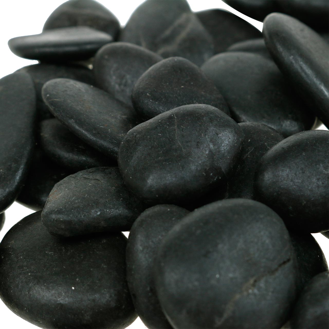 Los guijarros de color negro intenso se entregan en una red de plástico de 1 kg. Las piedras decorativas miden aproximadamente entre 2 y 3 centímetros de alto o largo, aunque este valor es solo una guía no vinculante.