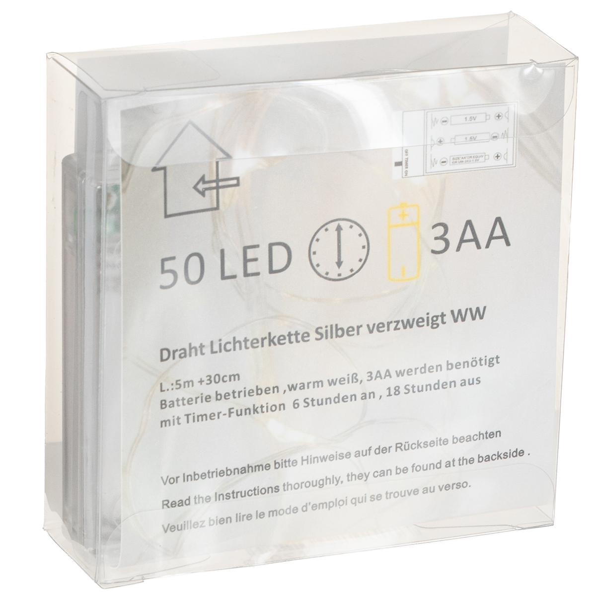 Nombre del producto: Guirnalda de luces LED, 50 bombillas, funciona con pilas, 5 m, luz blanca cálida