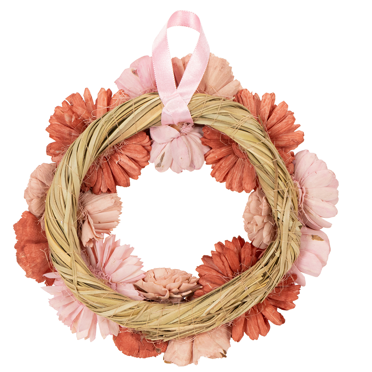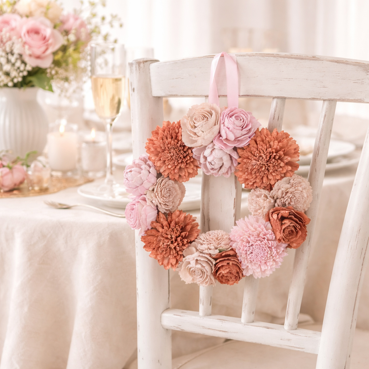 Esta corona floral cautiva a primera vista con su armoniosa combinación de colores en un delicado rosa. Las finas flores, cuidadosamente elaboradas con madera de sola de alta calidad, transmiten un encanto realista y único que brindará una alegría duradera. Las coronas florales colgantes como esta no solo son perfectas para decorar la pared de la sala, sino también como centros de mesa para ocasiones especiales. Se convertirá rápidamente en el centro de atención de tu boda o un brunch de primavera.