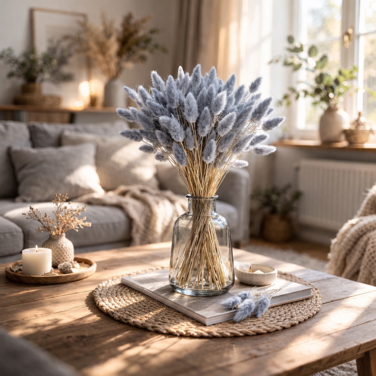 - Decoración natural en estilo escandinavo: combina la hierba cola de conejo con tonos de madera claros y accesorios minimalistas.