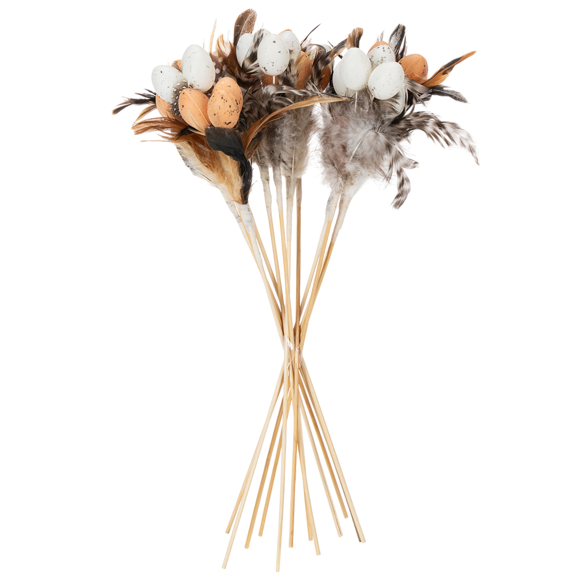 Huevos de codorniz artificiales, plumas decorativas en un palito, 36 cm, 12 unidades