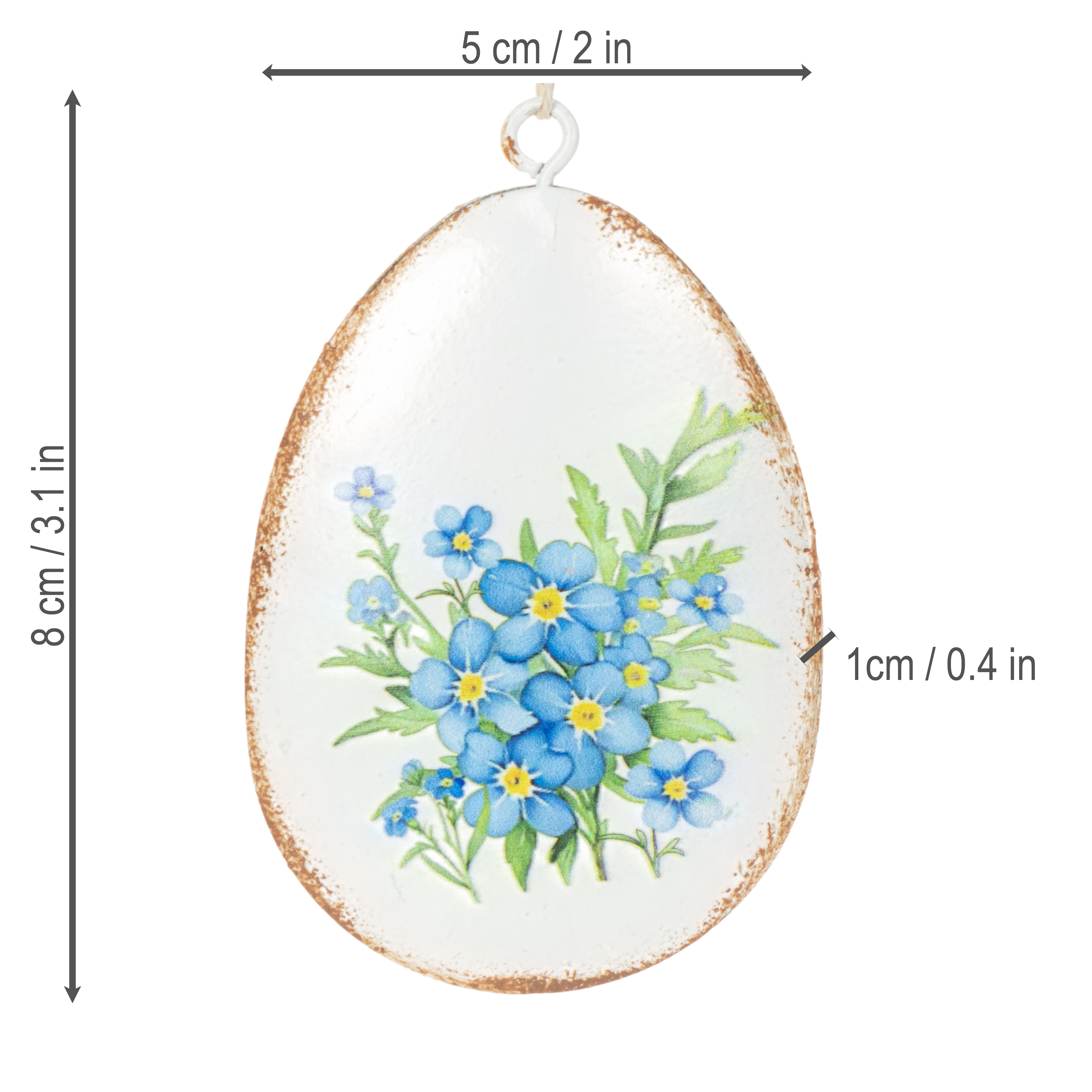 Estos huevos de Pascua decorativos de metal impresionan por su tamaño y apariencia. Con 8 cm de alto y 5 cm de diámetro, son perfectos para diversos usos. Su base blanca ligeramente mate se complementa con cuatro motivos florales diferentes que inspiran la primavera: desde delicados nomeolvides hasta vibrantes narcisos. Su sutil estilo vintage los hace especialmente elegantes y perfectos para decoraciones de estilo retro, shabby chic o rústico.