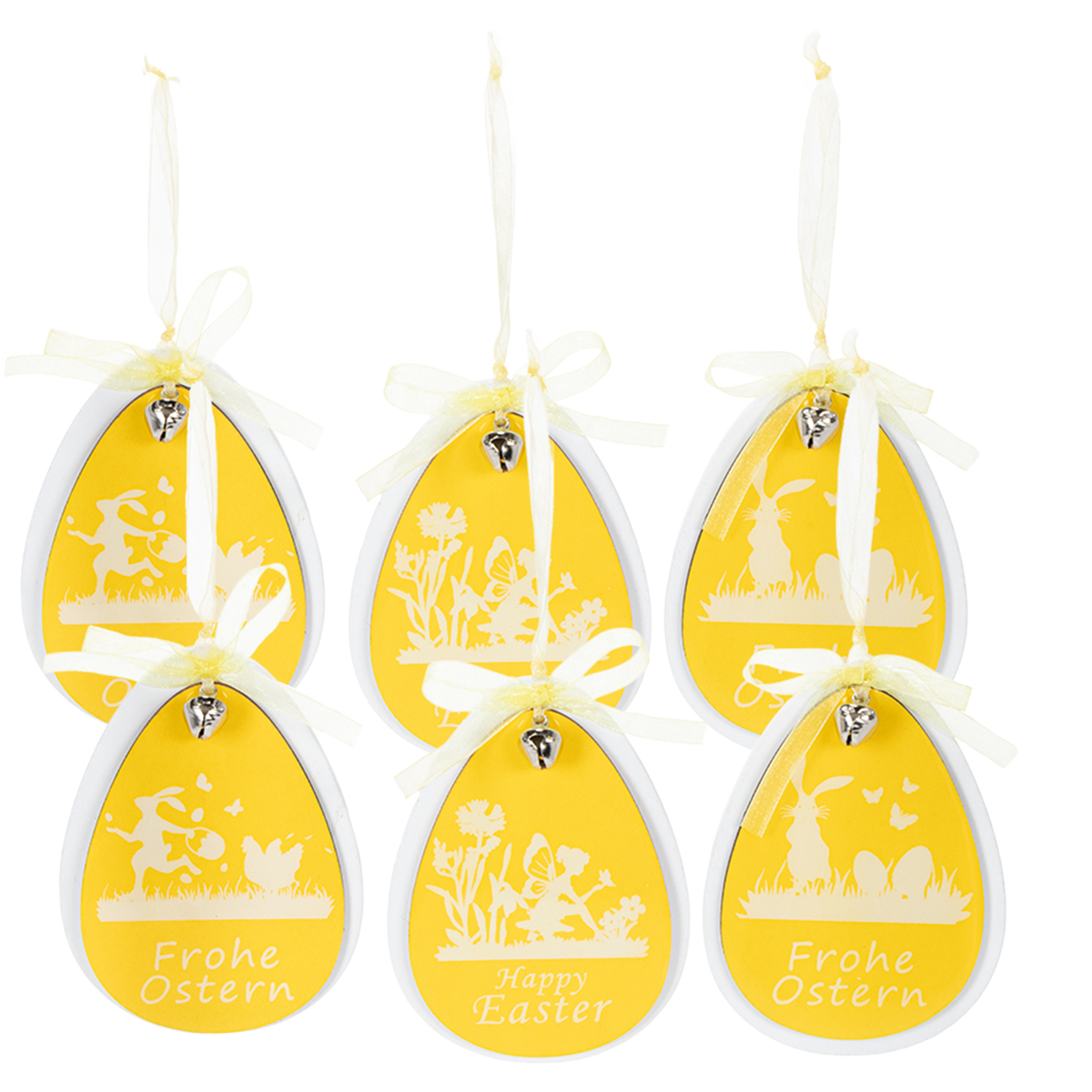 La decoración de madera consiste en la silueta blanca de un huevo de Pascua, que se mantiene unido por la percha con uno más pequeño en amarillo. Un paisaje primaveral está impreso en blanco en el colgante amarillo brillante y lacado, en el que un elfo se arrodilla para dejar que una mariposa descanse en su mano. El deseo "Felices Pascuas" acompaña al motivo nostálgico de la Pascua. Una pequeña campana plateada y una cinta translúcida de color amarillo limón completan la atmosférica decoración de Pascua de la marca de calidad VIANA.