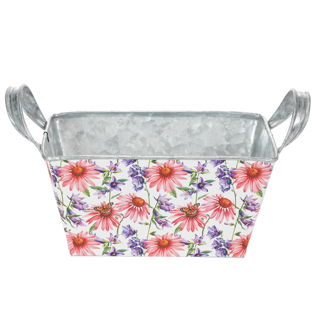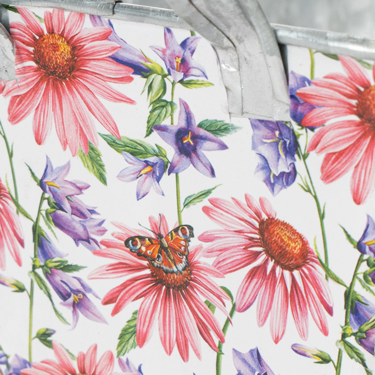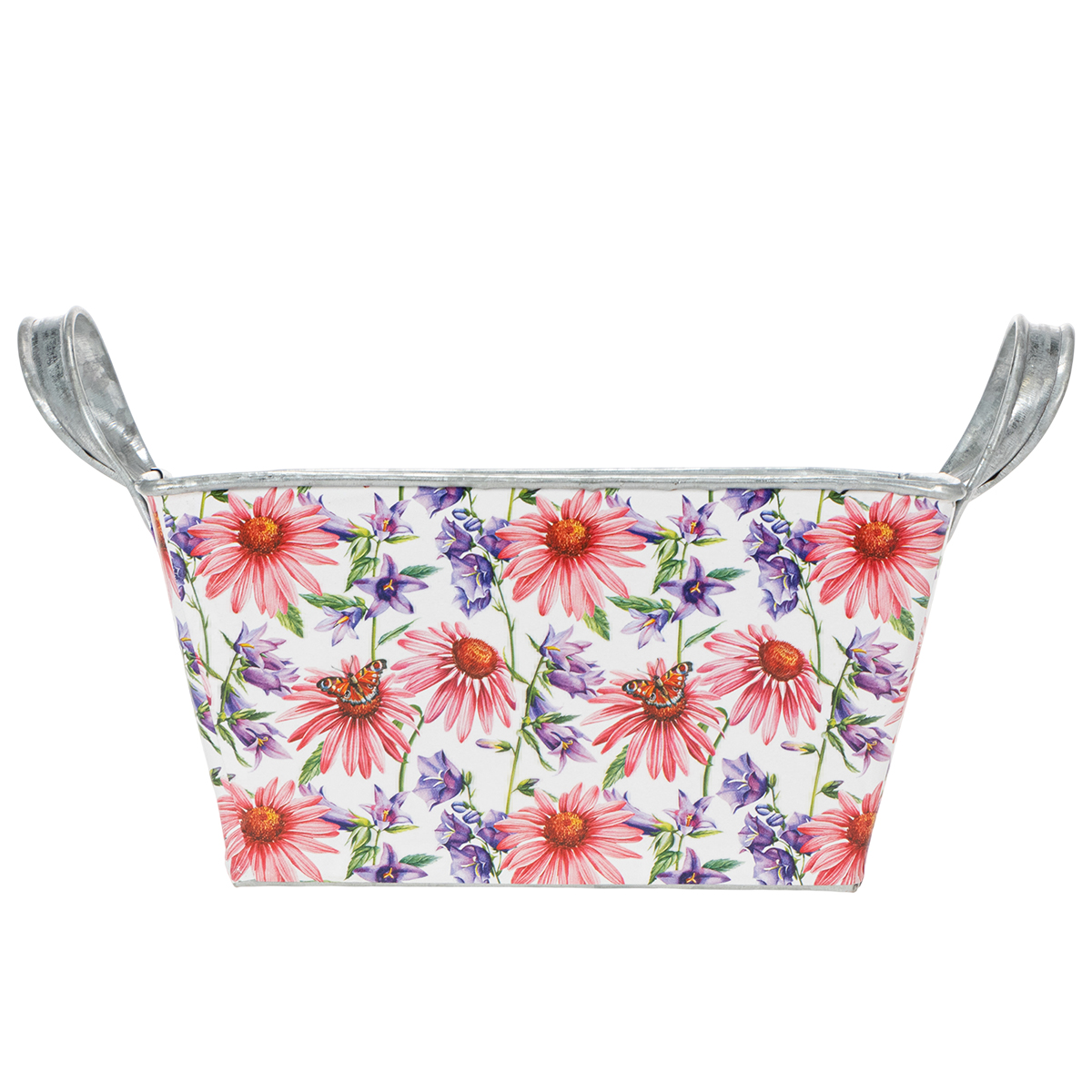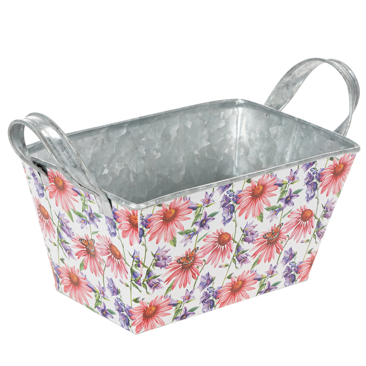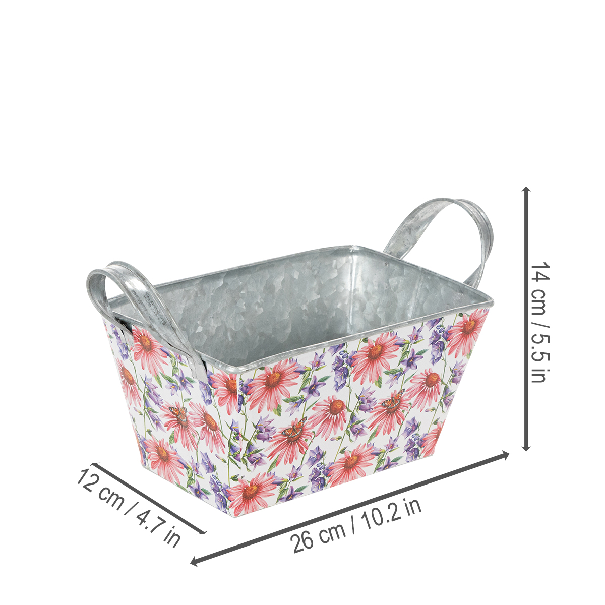 Las flores de primavera rosas y lilas sobre un fondo blanco crean un marco variado y optimista. El motivo floral se imprimió en una lámina resistente que, a su vez, se adhiere al recipiente de zinc. De esta forma, el interior con el zinc plateado forma un fuerte contraste en la decoración primaveral.