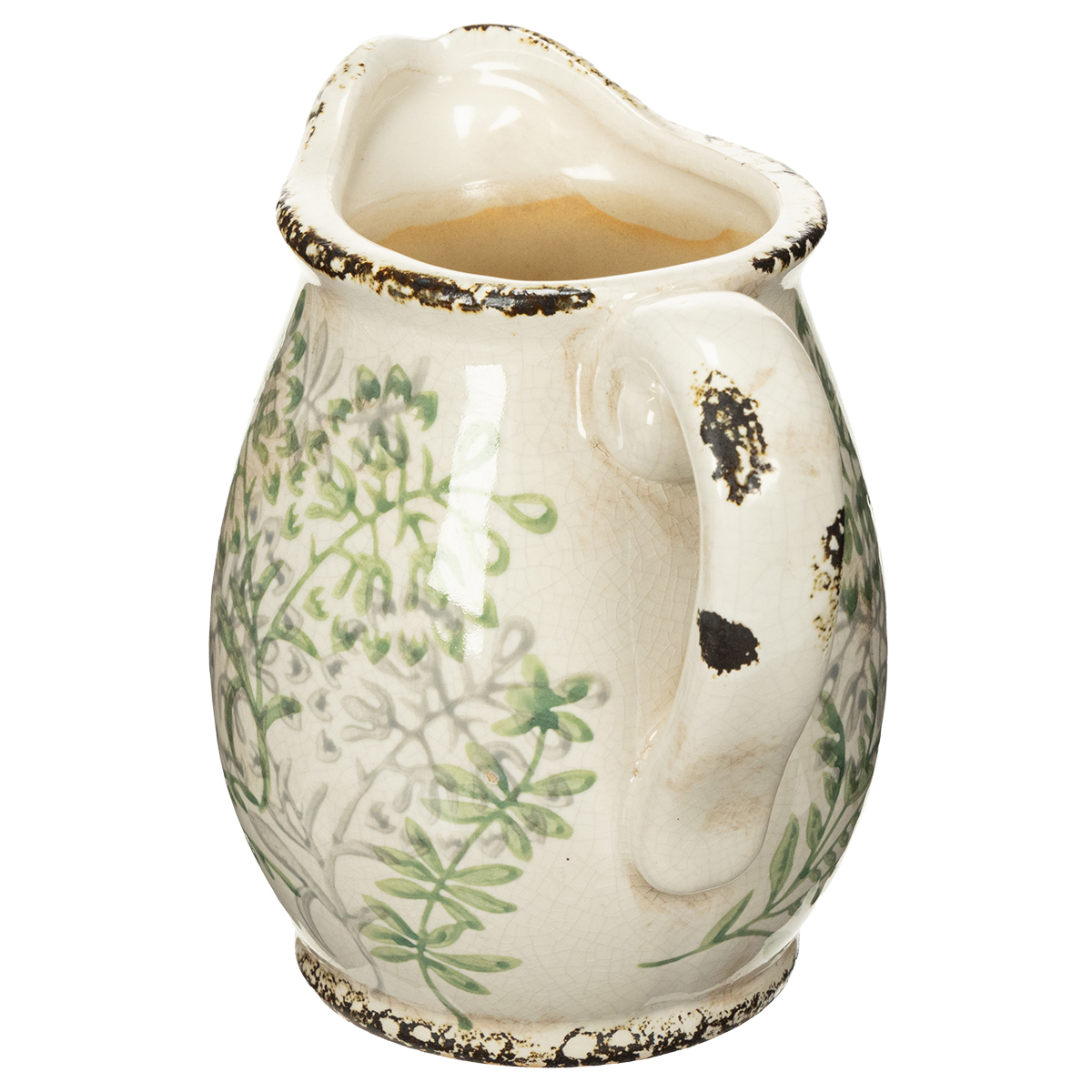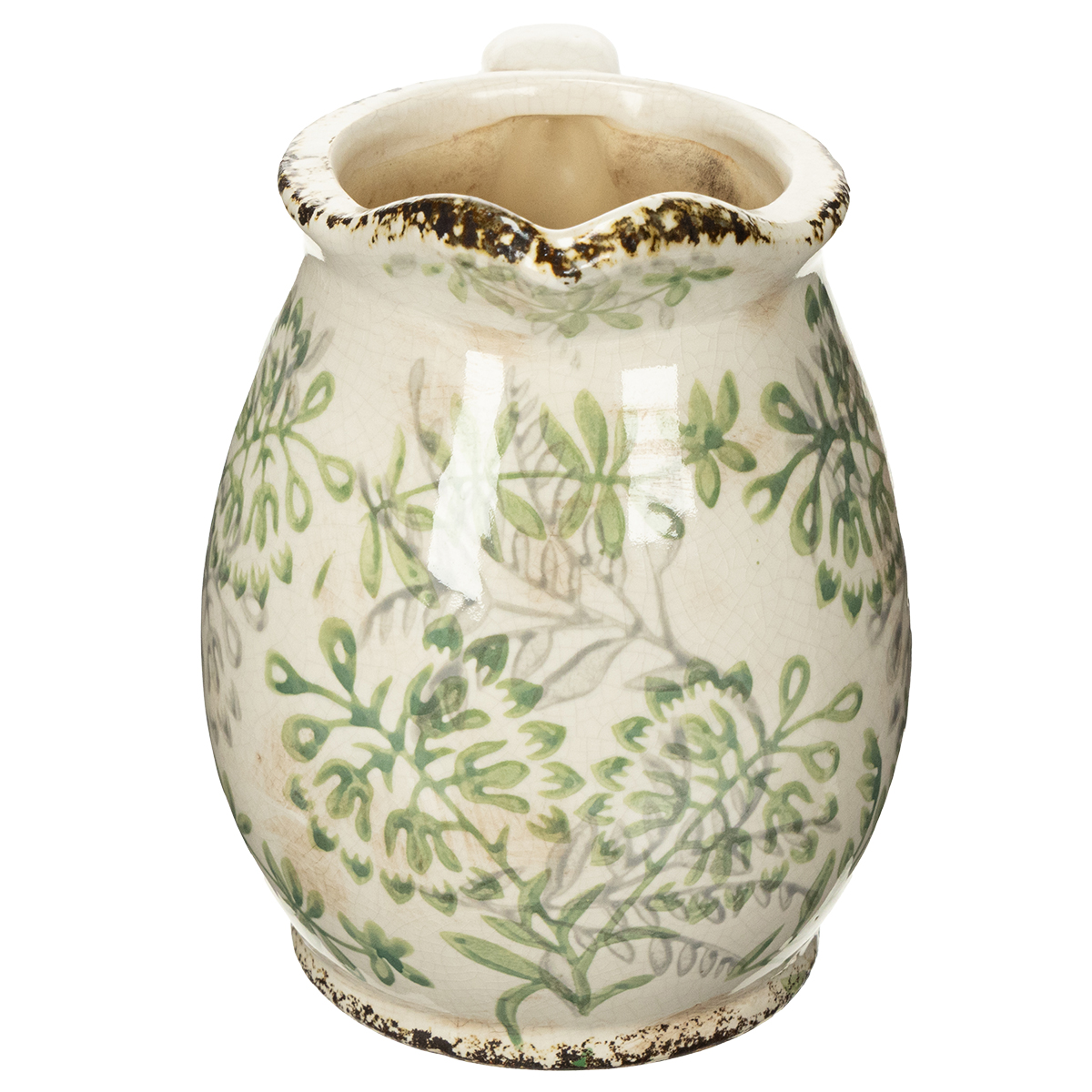Esta jarra vintage para plantas es un verdadero todoterreno en cuanto a decoración. Con su forma atemporal, acabado rústico y encantadores detalles, se integra a la perfección en cualquier hogar de estilo rústico. Puedes usarla como maceta decorativa que realce tus plantas con encanto. Imagina esta jarra de cerámica sobre una pequeña mesa de salón, llena de flores frescas. Sus dimensiones (16 cm de alto y 13 cm de diámetro) la hacen ideal para arreglos florales pequeños sin que parezca recargada. Para un aspecto más natural, puedes plantarla con hierbas frescas. La albahaca, el perejil o el romero encontrarán un lugar elegante aquí, ya sea en la cocina o en el patio. La combinación de blanco y verde crea un efecto armonioso y aporta un aire fresco a tu decoración. Esta nostálgica maceta combina especialmente bien con otros elementos rústicos, como muebles de madera o textiles shabby chic. También es una maravillosa idea de regalo, tanto para amantes de las plantas como para los amantes del estilo rústico.
