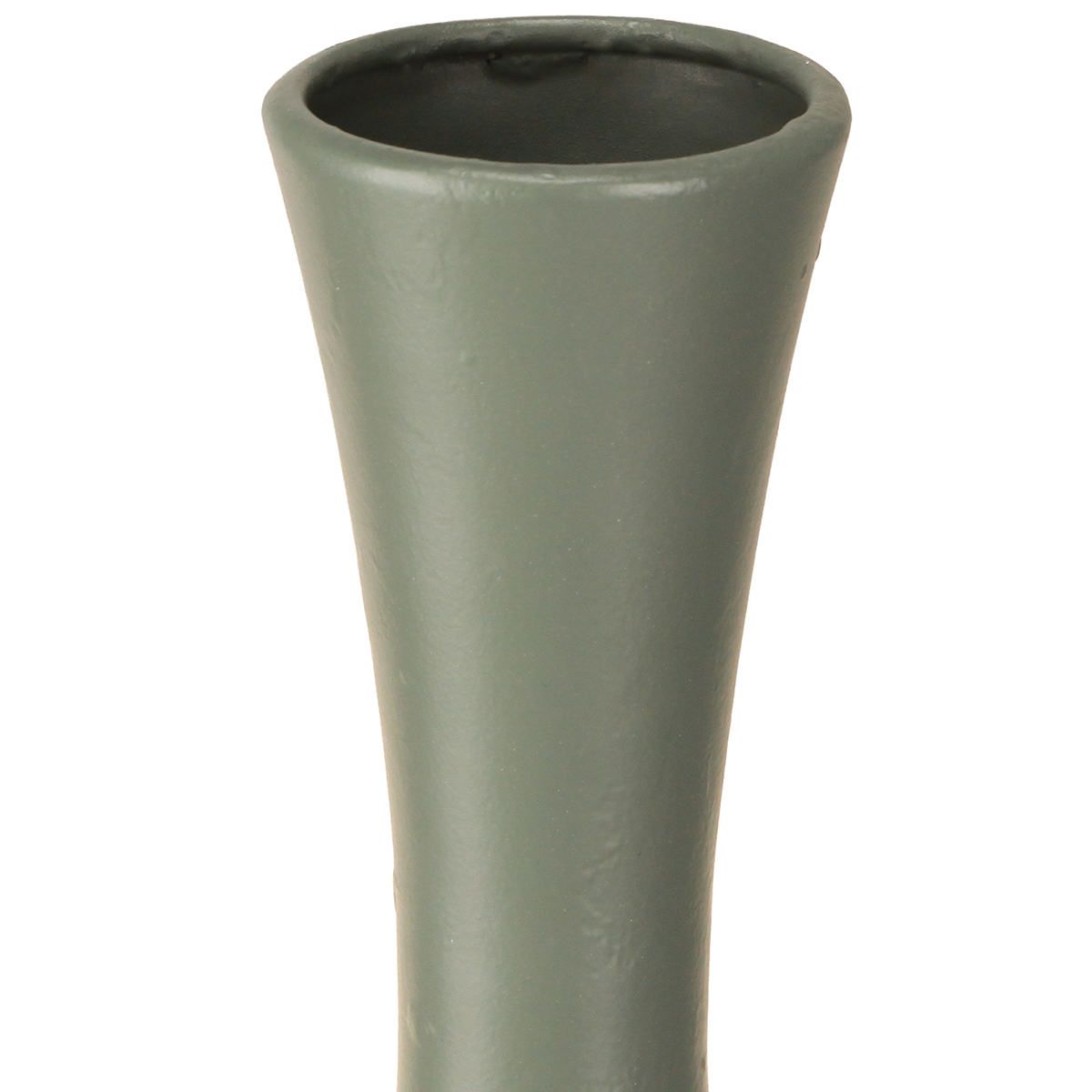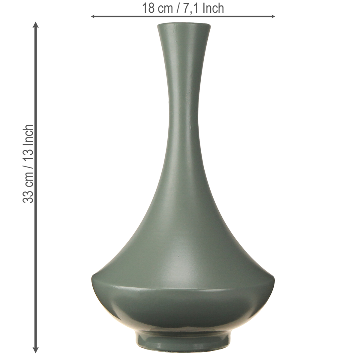 Este jarrón decorativo cautiva con su forma armoniosamente curvada y su artesanía en metal de alta calidad. Su acabado verde mate es a la vez sobrio y elegante, realzando su carácter moderno. Ya sea como pieza central en el comedor, como detalle decorativo en una cómoda o como un elegante elemento en un escritorio de oficina, su versatilidad lo convierte en un accesorio indispensable para cualquier hogar. Con 33 cm de altura, tiene el tamaño perfecto para integrarse a la perfección en cualquier estancia sin dejar de ser un elemento destacado. A quienes aprecian la estética minimalista les encantará, pero también combina a la perfección con otras piezas decorativas.