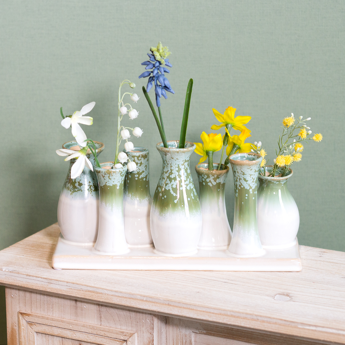 Este juego de siete pequeños jarrones decorativos de cerámica en una bandeja de colores coordinados se convertirá rápidamente en el elemento destacado de su decoración. Los armoniosos tonos verde y blanco evocan la naturalidad del diseño escandinavo y complementan a la perfección estilos minimalistas o rústicos. Los jarrones tienen diferentes formas, lo que realza el atractivo visual del color crema. Ya sea en grupo o individualmente, este juego ofrece innumerables posibilidades de diseño.