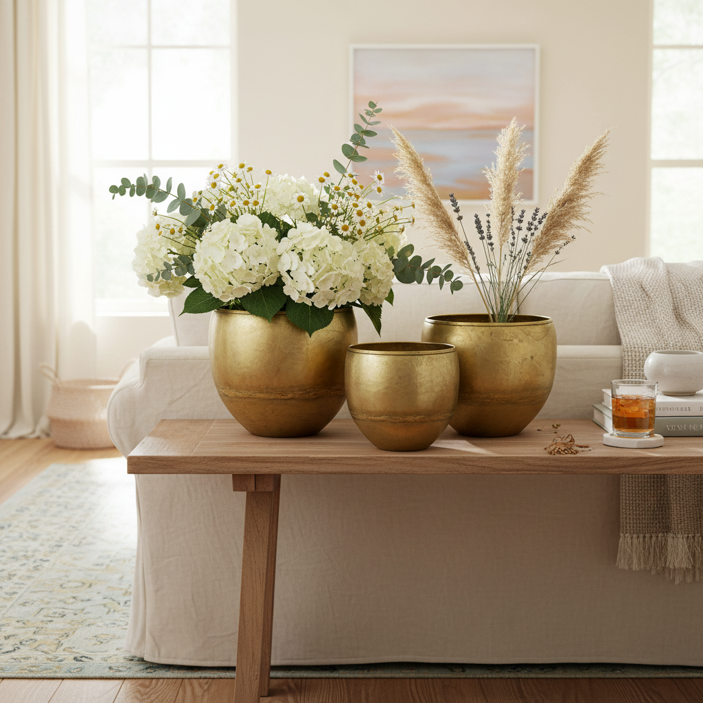 Pero, por supuesto, puede usar todo el volumen llenando los jarrones de metal con arena decorativa o piedras decorativas. Alternativamente, puede ponerle espuma floral y llenar el recipiente de metal con flores artificiales o secas a su gusto.