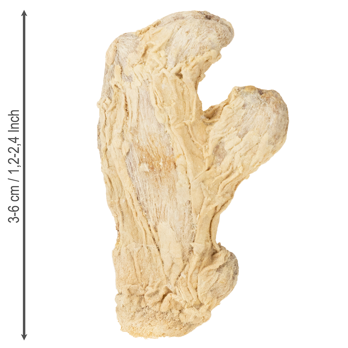 El jengibre seco se entrega en una bolsa de 500 gramos. El tamaño de las piezas individuales varía y puede oscilar entre 3 y 6 centímetros.