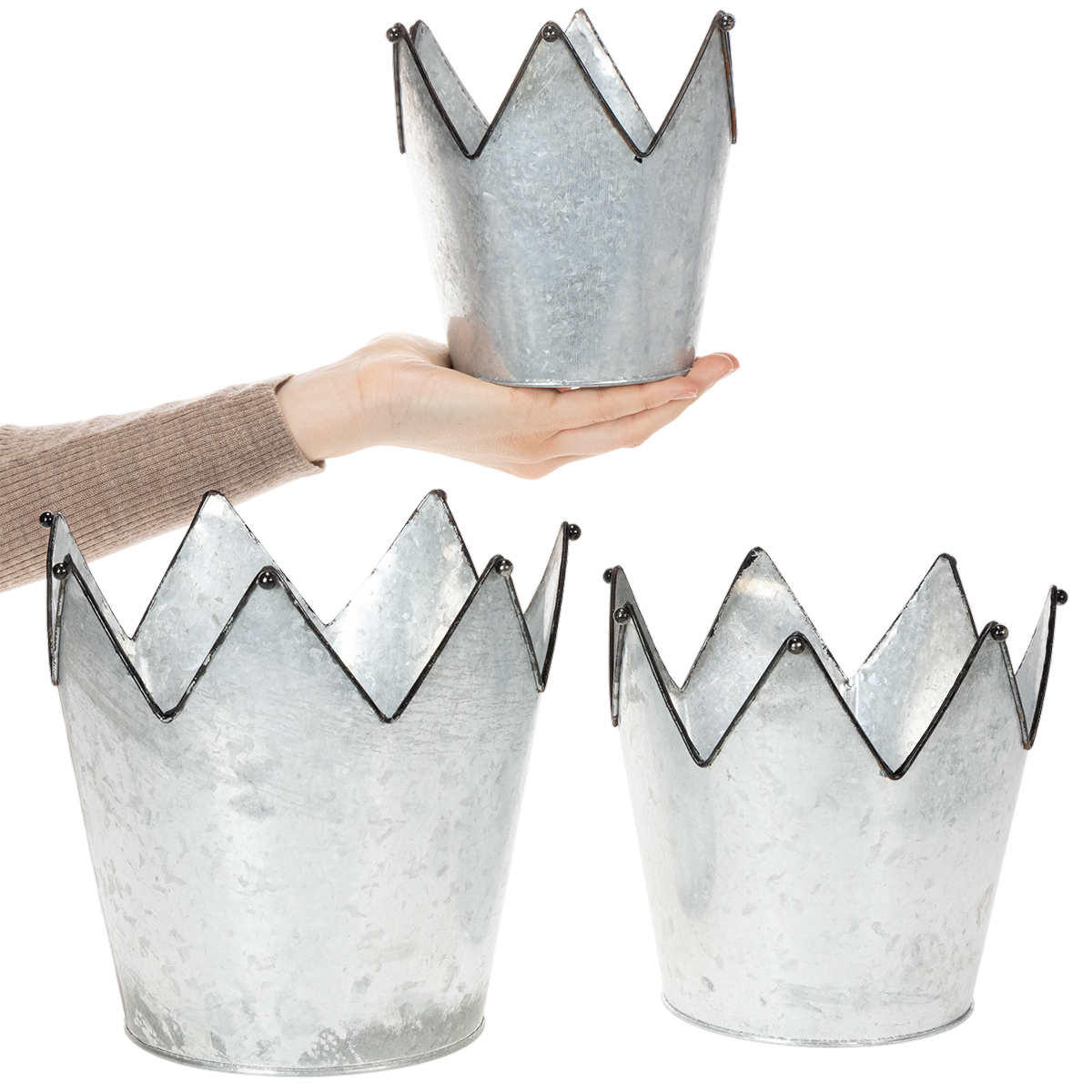 También hay una bola negra en cada uno de los picos. Las bolas ornamentales hacen que todo el macetero en forma de corona sea un poco más elegante. La jardinera de zinc de diseño cónico se estrecha hacia la base interior. El patrón típico de chapa le da a la corona un brillo metálico por dentro y por fuera.