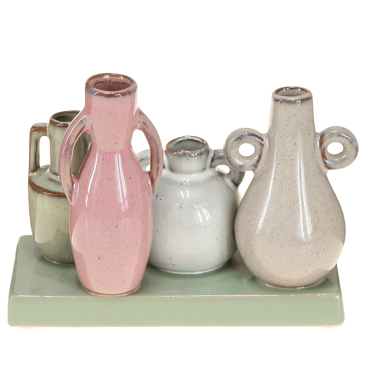 Este mini juego de jarrones de cerámica consta de cuatro jarrones pequeños dispuestos sobre una sencilla bandeja verde. Cada jarrón tiene una forma única, desde bulbosa hasta esbelta, con asas decorativas o curvas sencillas. Esta variedad garantiza que el conjunto cree una apariencia armoniosa sin perder su carácter individual. La paleta de colores rosa, verde y blanco evoca la frescura primaveral sin resultar abrumadora. Una ventaja indudable: la cerámica de alta calidad, con su superficie lisa y brillante, le da al conjunto un toque elegante. Ya sea con flores frescas de primavera, ramas secas o incluso sin flores, estos pequeños jarrones siempre llaman la atención. Encajan a la perfección en diseños de interiores minimalistas modernos o escandinavos. Y para quienes prefieren un ambiente más acogedor, el conjunto también puede lucirse en un estilo rústico, quizás combinado con elementos de madera o de punto. Simplemente impresionantes combinados con manteles individuales de colores claros o candelabros dorados. Gracias a sus compactas dimensiones (14 cm de largo, 7 cm de ancho y 11 cm de alto), este juego encaja prácticamente en cualquier lugar: en aparadores estrechos, como decoración de mesa en el comedor o como un elegante detalle en estanterías. Su robusta construcción garantiza un disfrute duradero. Quien busque una decoración discreta pero con estilo quedará encantado.