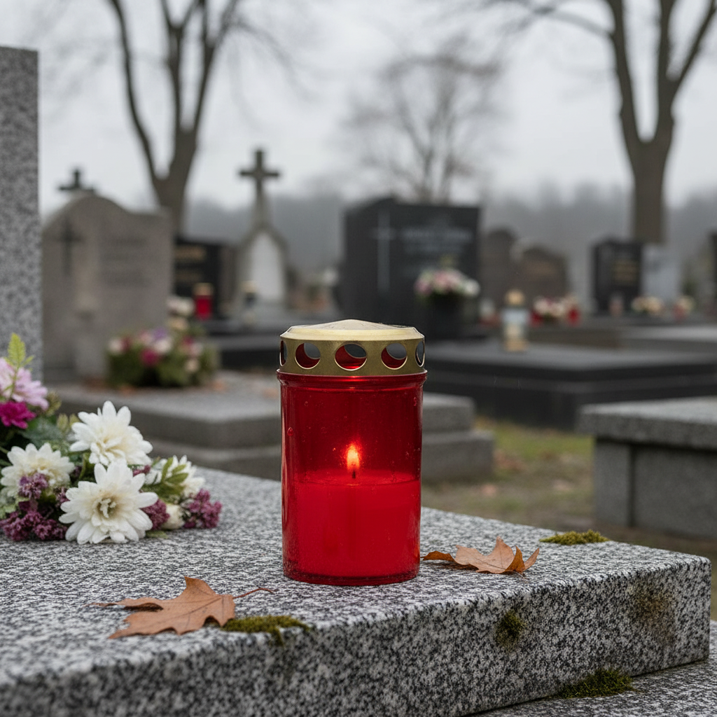 Con esta luz cilíndrica para tumbas en rojo, completa un diseño digno de tumbas y puede rellenar linternas de tumbas. Las prácticas velas para tumbas consisten en cera blanca para velas, una cubierta de plástico rojo y están terminadas con una tapa dorada, que tiene agujeros de aire prácticos en los lados. Esto protege la vela del viento y el clima, al mismo tiempo que ilumina la tumba pacíficamente. También tiene la oportunidad de incorporar las luces de la tumba en un arreglo funerario para crear un servicio conmemorativo.