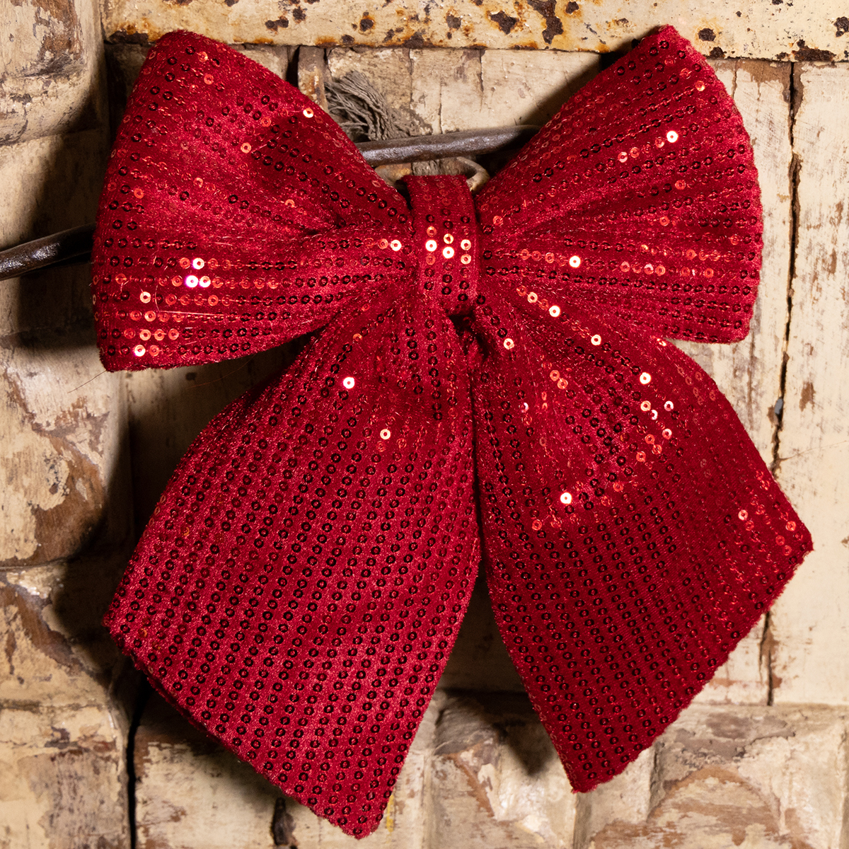 Gran lazo de terciopelo en rojo oscuro: elegancia y lentejuelas con un brillo festivo.