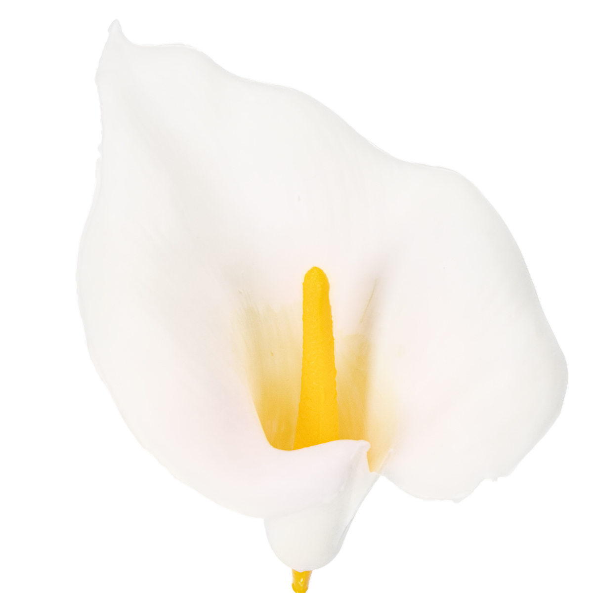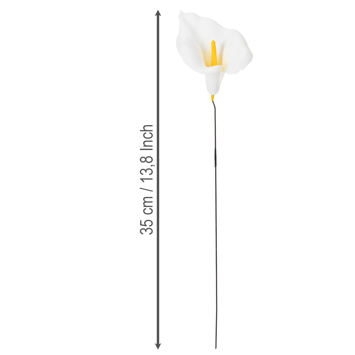 La pequeña cala en el alambre en blanco está en una bolsa de 50 piezas. La longitud total de cada calla de pantano artificial es de aproximadamente 35 centímetros, con el alambre de metal marrón y flexible es de aproximadamente 27 centímetros de largo. La cabeza de la flor blanca tiene una longitud de aproximadamente 10 centímetros y en el centro también tiene una varilla de polen amarillo muy bien imitada, cuyo embudo circundante también es de color ligeramente amarillento.