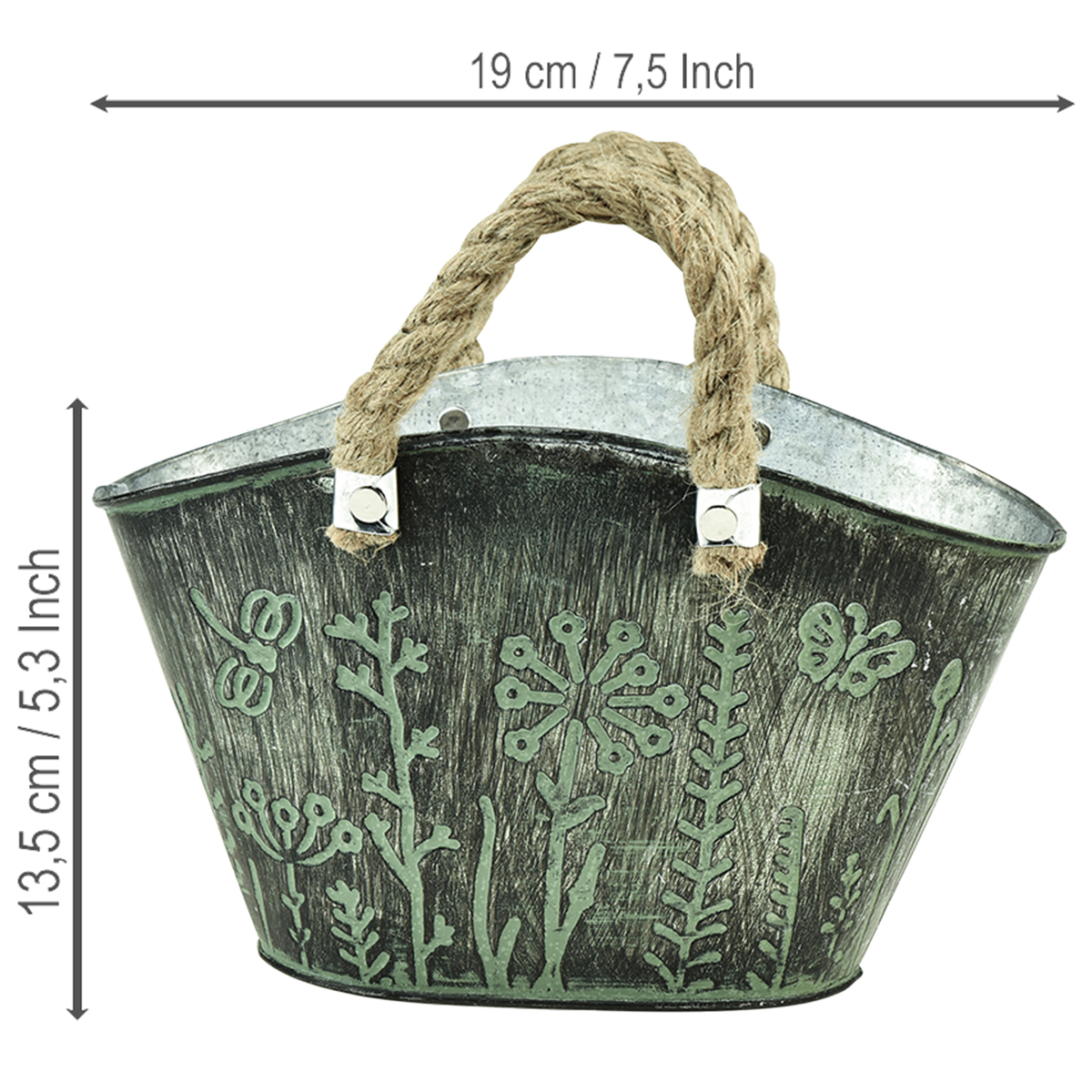 La jardinera tiene la forma de una bolsa de compras tejida y tiene un aspecto muy relajado. El exterior de la maceta de metal está tratado en verde y gris oscuro y su aspecto se caracteriza por un estilizado prado de flores silvestres. Los mangos trenzados de fibra natural hacen el resto para hacer del macetero ovalado una pieza muy especial.