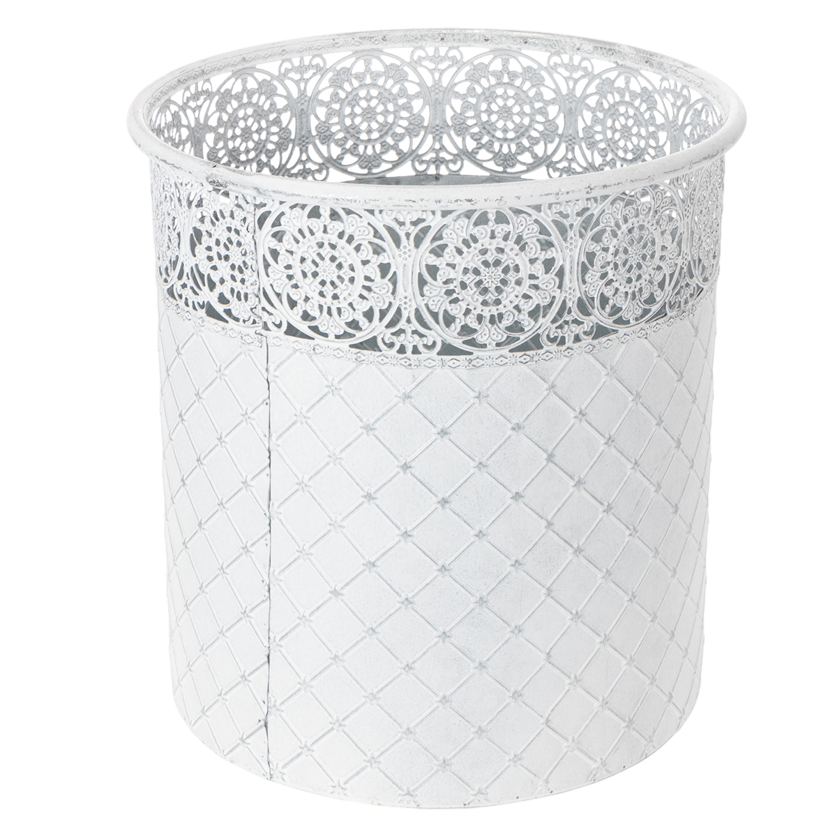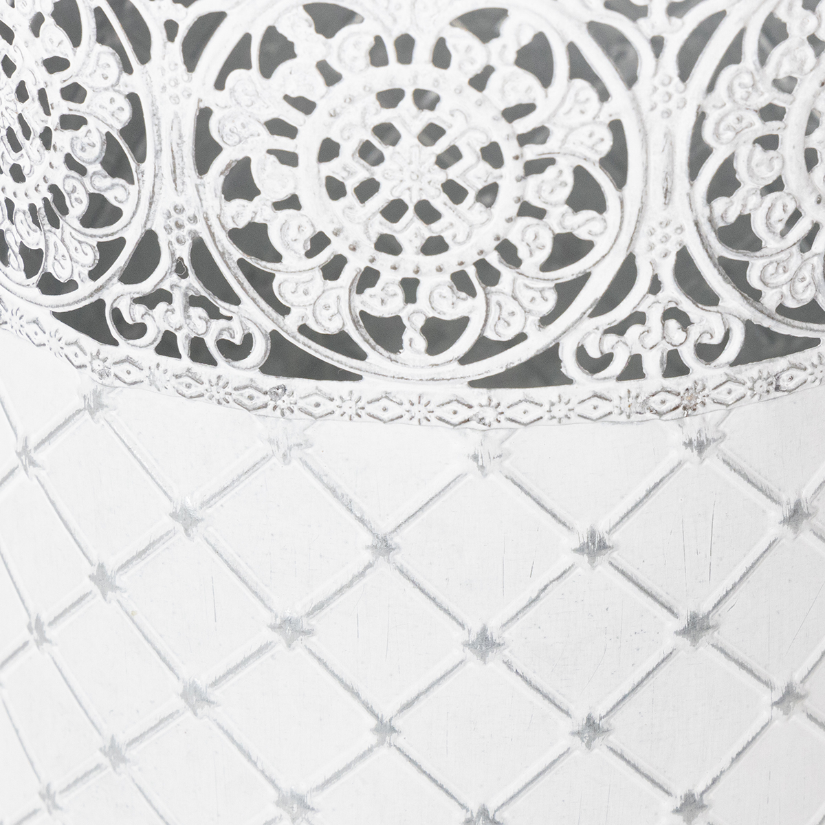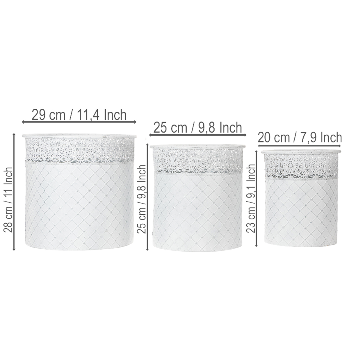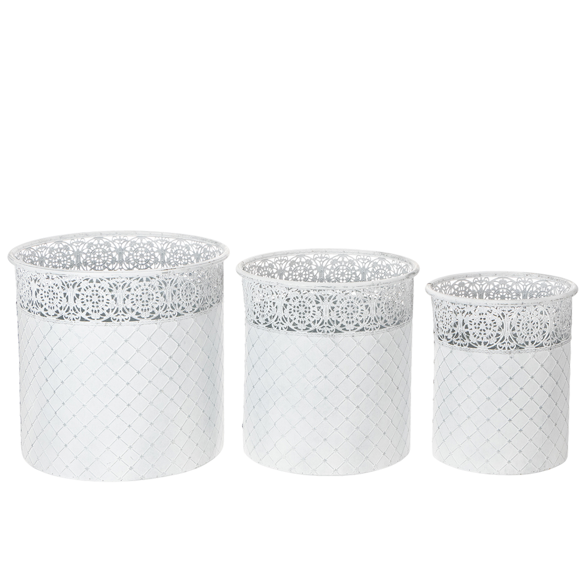 Maceta con diseño de encaje, recipiente de metal, cubo decorativo, blanco, plateado, estilo shabby chic, H28/25.5/23.5cm, Ø29.5/25.5/20cm, juego de 3