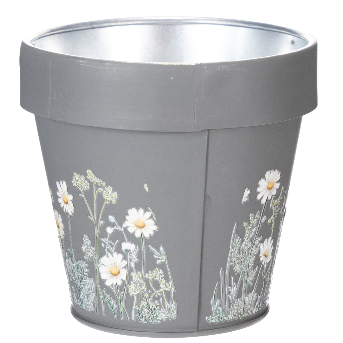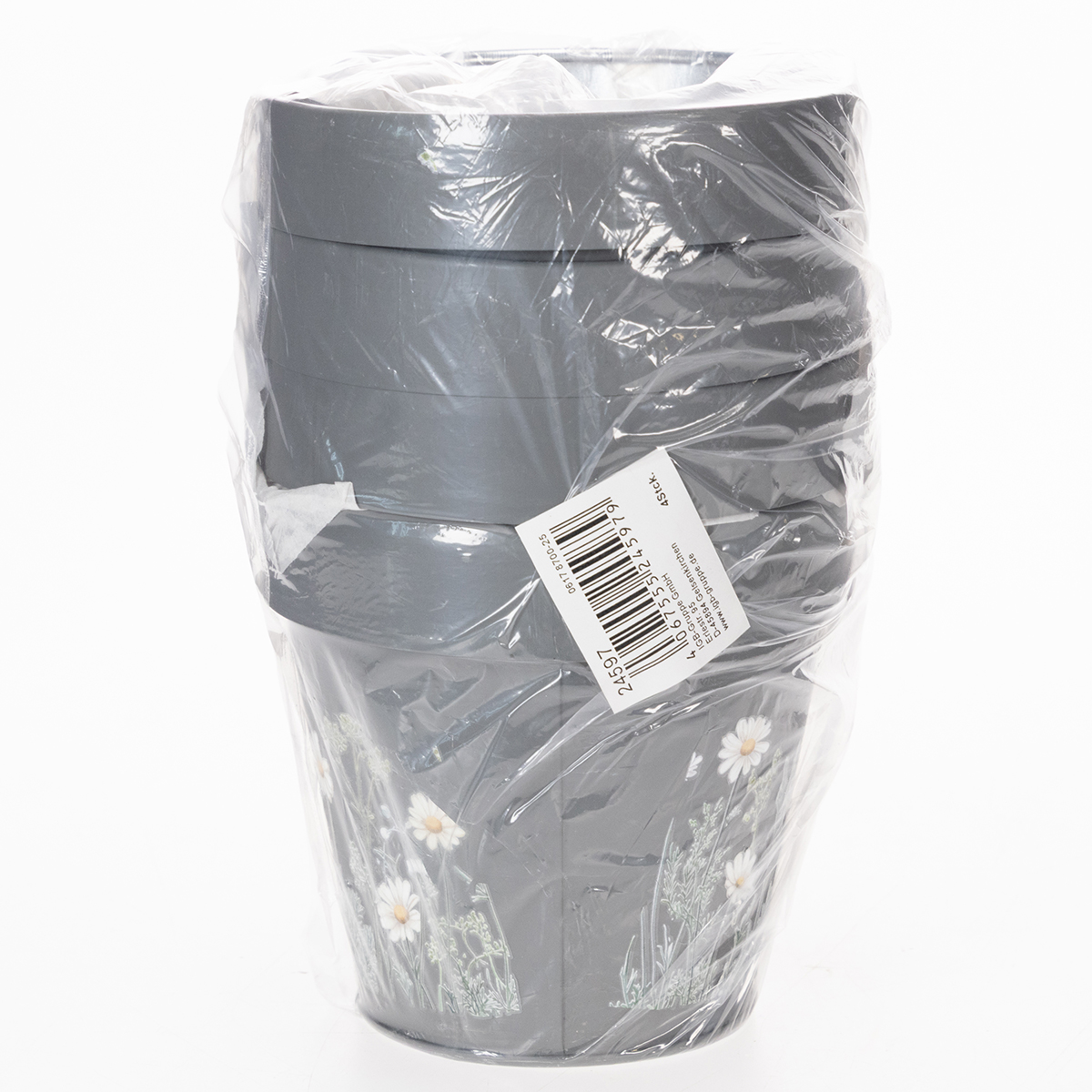 Esta maceta decorativa con motivos de margaritas aportará un aire fresco a tu decoración. Ya sea en el alféizar de la ventana, en una estantería del salón o en un escritorio, su sutil diseño gris se integra armoniosamente en cualquier ambiente. El encantador motivo floral añade un toque de naturaleza y alegría de vivir a cualquier estancia. Cuatro macetas en un set: para que puedas crear varios oasis acogedores. Práctica y ligera, fabricada en metal resistente, esta maceta no solo es bonita, sino también sorprendentemente versátil. ¡Un pequeño detalle que combina estilo y funcionalidad!