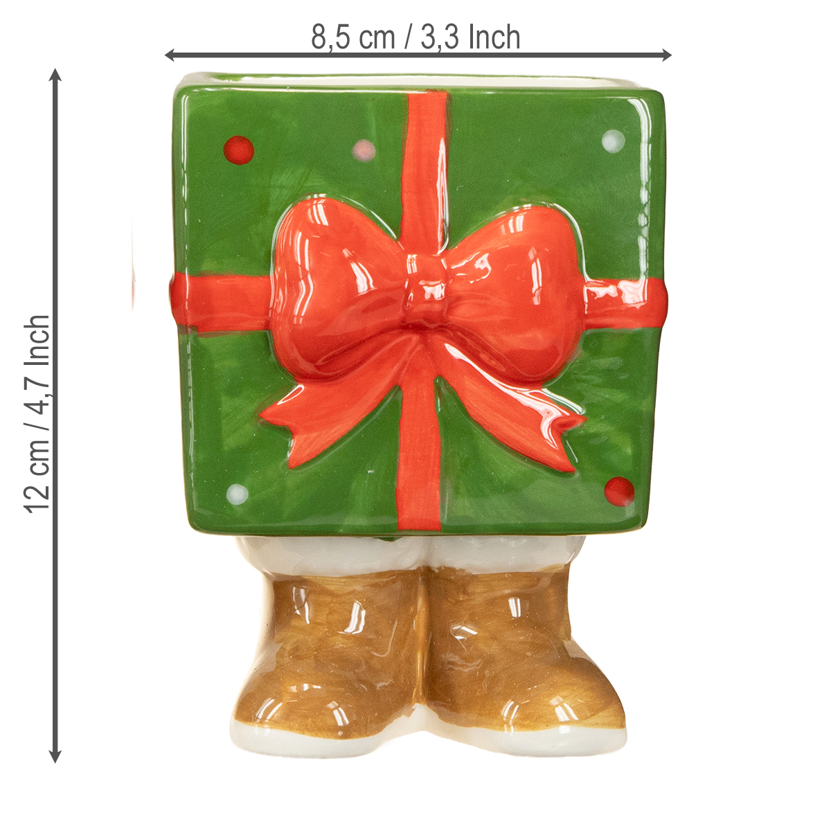 Adornos navideños originales con un toque especial, en este caso, con patas: ¡Déjate cautivar por esta maceta navideña de cerámica! Estos encantadores paquetes de regalo con patas y un gran lazo rojo son perfectos para cualquier mesa durante el Adviento, o incluso para el alféizar de la ventana. Ya sea en el salón, sobre la mesa o como un original punto de atracción en la oficina: estas pequeñas obras de arte crean un ambiente cálido y festivo en cualquier ambiente durante la Navidad.