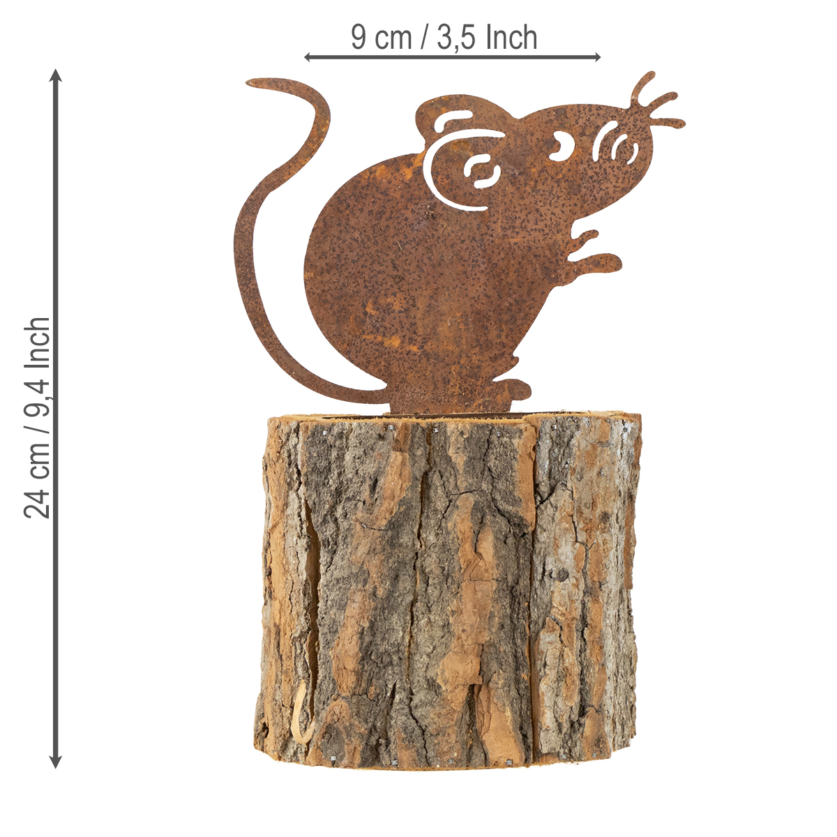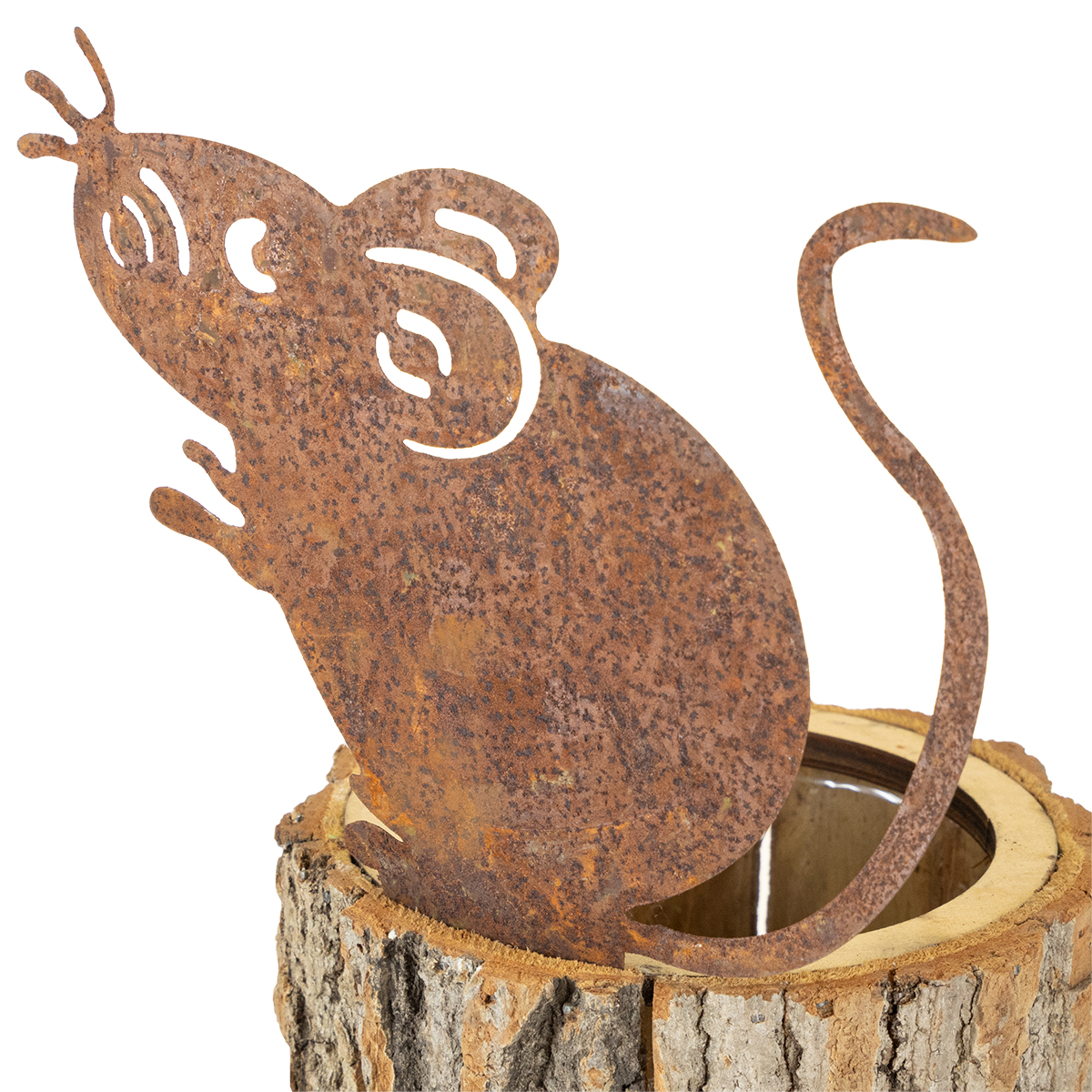 En el borde hay un ratón de chapa que está cubierto con una maravillosa pátina de pátina. La abertura en la parte superior consiste en un anillo de madera a través del cual se pueden insertar diferentes plantas.