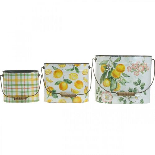 Maceta de metal amarillo verdoso, decoración veraniega, cubo con asa, motivo limón mediterráneo L28/22,5/cm H23/18/15cm