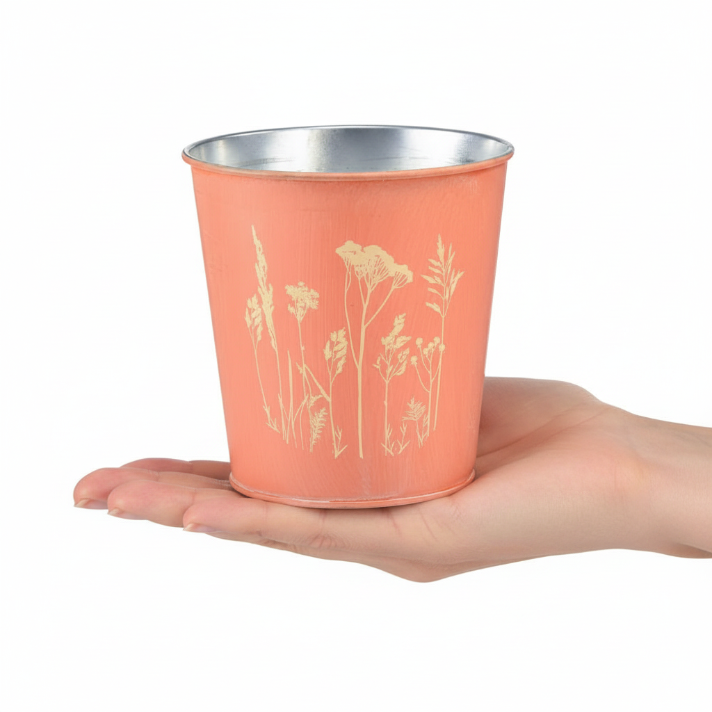 Recibirás la maceta de metal decorada por un lado. También tenemos otras versiones de esta maceta veraniega en nuestra gama.