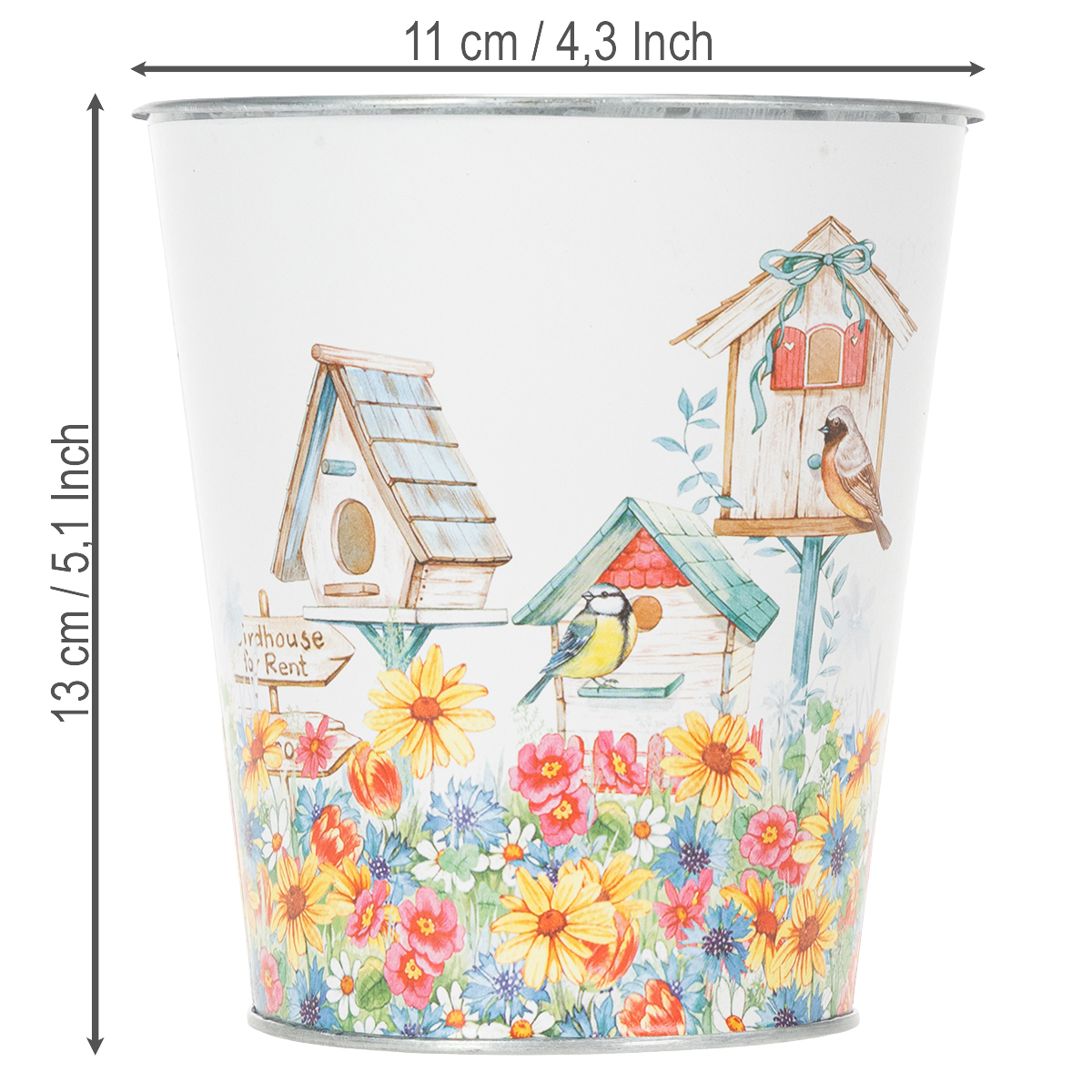 Maceta de metal con motivo, maceta con casitas para pájaros, cubo de hojalata H13cm Ø11.5cm