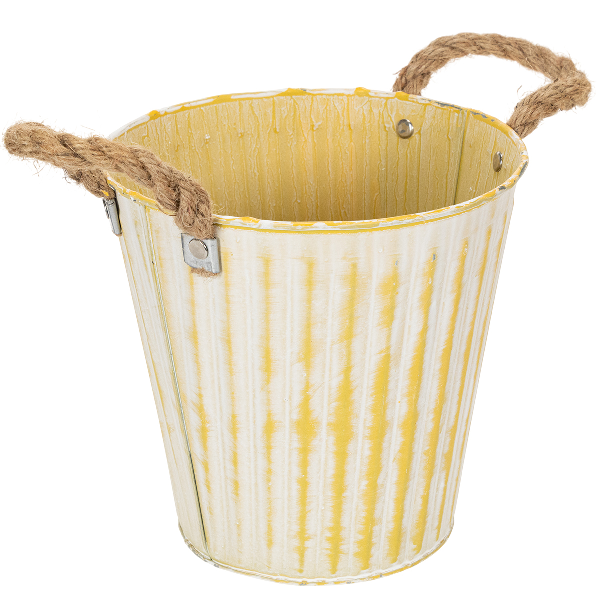 Este macetero de metal es perfecto para las decoraciones de primavera: en amarillo pastel, el macetero con asas de cuerda de yute se presenta en blanco lavado en un moderno shabby chic.