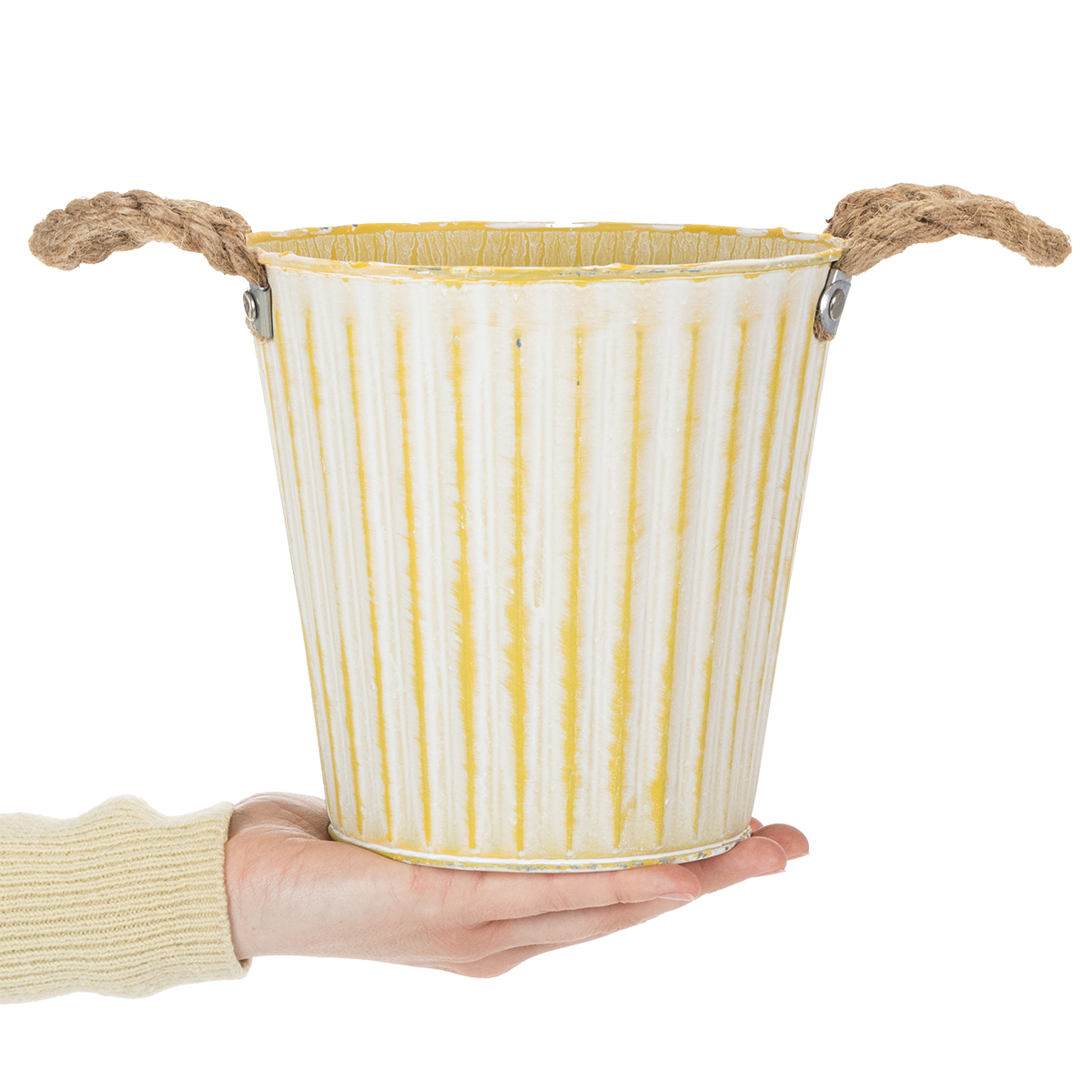 Este macetero de metal es perfecto para las decoraciones de primavera: en amarillo pastel, el macetero con asas de cuerda de yute se presenta en blanco lavado en un moderno shabby chic.