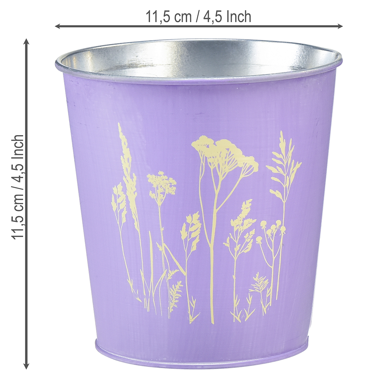 El macetero de metal está decorado con un prado de flores. En la maceta violeta aparecen flores de pradera con un brillo dorado.