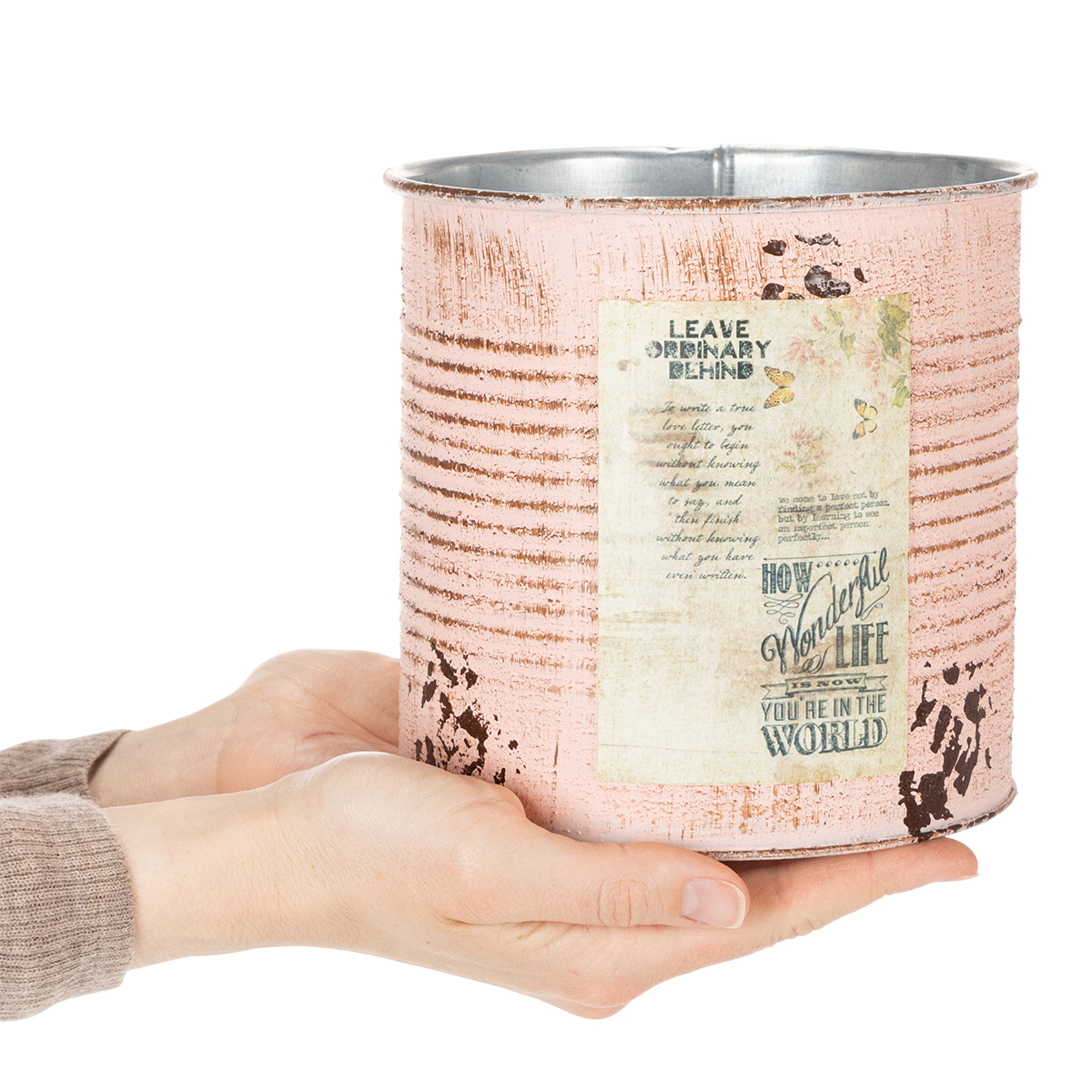 ¡Esta maceta de color salmón de una lata decorativa hace que el verano sea colorido! Elaboradamente pintado con espray de óxido y un color pastel seleccionado, el contenedor de metal se puede utilizar como macetero o macetero. Una pegatina vintage subraya el aspecto refinado y nostálgico de la lata. El hecho de que la decoración de metal sea realmente nueva solo se puede ver desde el interior de color plateado. Por supuesto, esta caja, que está hecha especialmente como macetero, no tiene bordes afilados en el interior.
