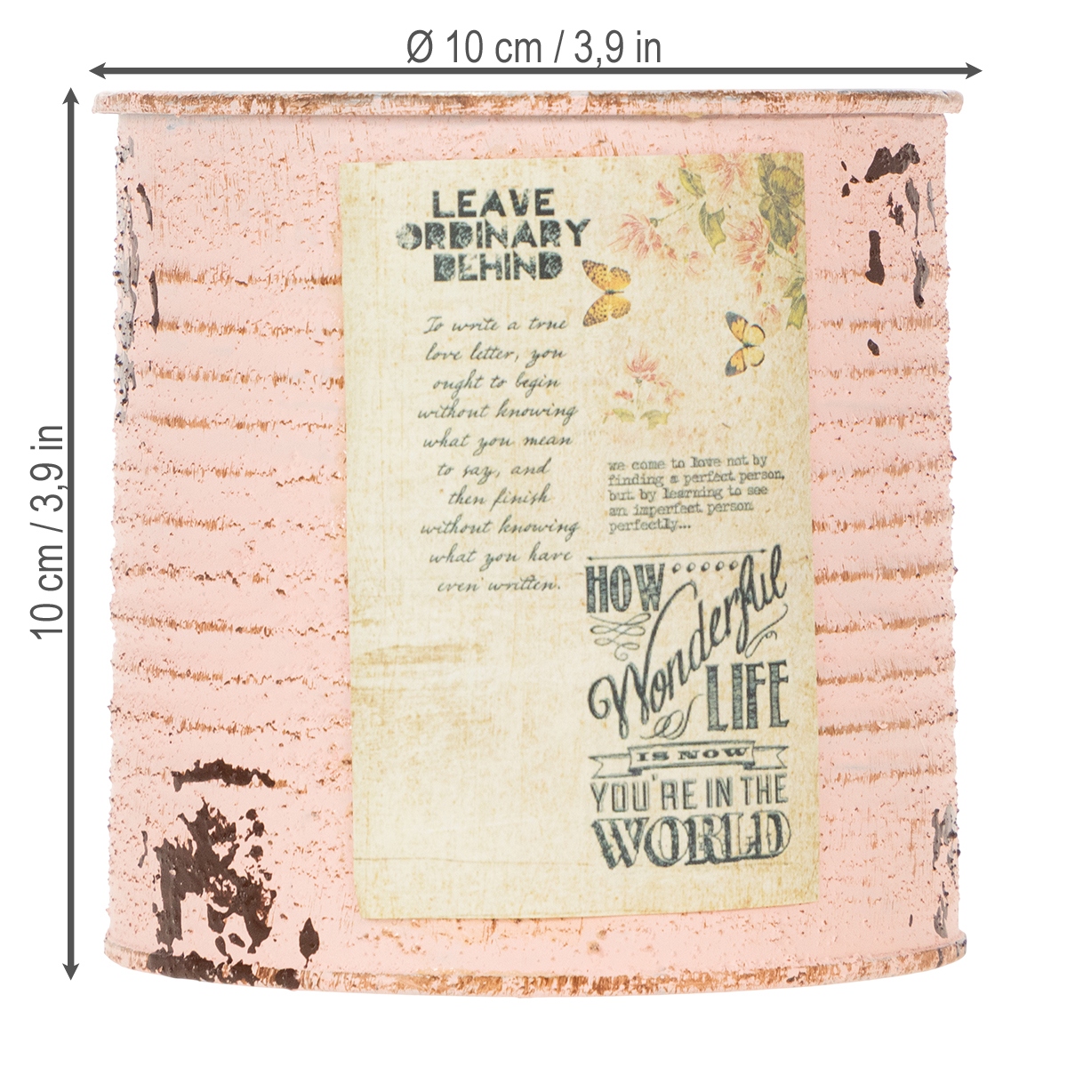 La maceta hecha de una lata decorativa en color salmón pastel es al menos tan atmosférica como una lata vintage real. Sin embargo, la decoración de verano hecha de metal tiene la ventaja decisiva de que aquí no hay bordes afilados. De esta manera puedes plantar la lata sin riesgo de lesionarte. Un tono marrón oxidado emerge debajo del color pastel cepillado en las ranuras de la lata. Además, las manchas de óxido pintadas y una etiqueta nostálgica enfatizan el estilo shabby chic de la lata retro. El interior de la maceta decorativa se mantiene de forma muy sencilla en plata.