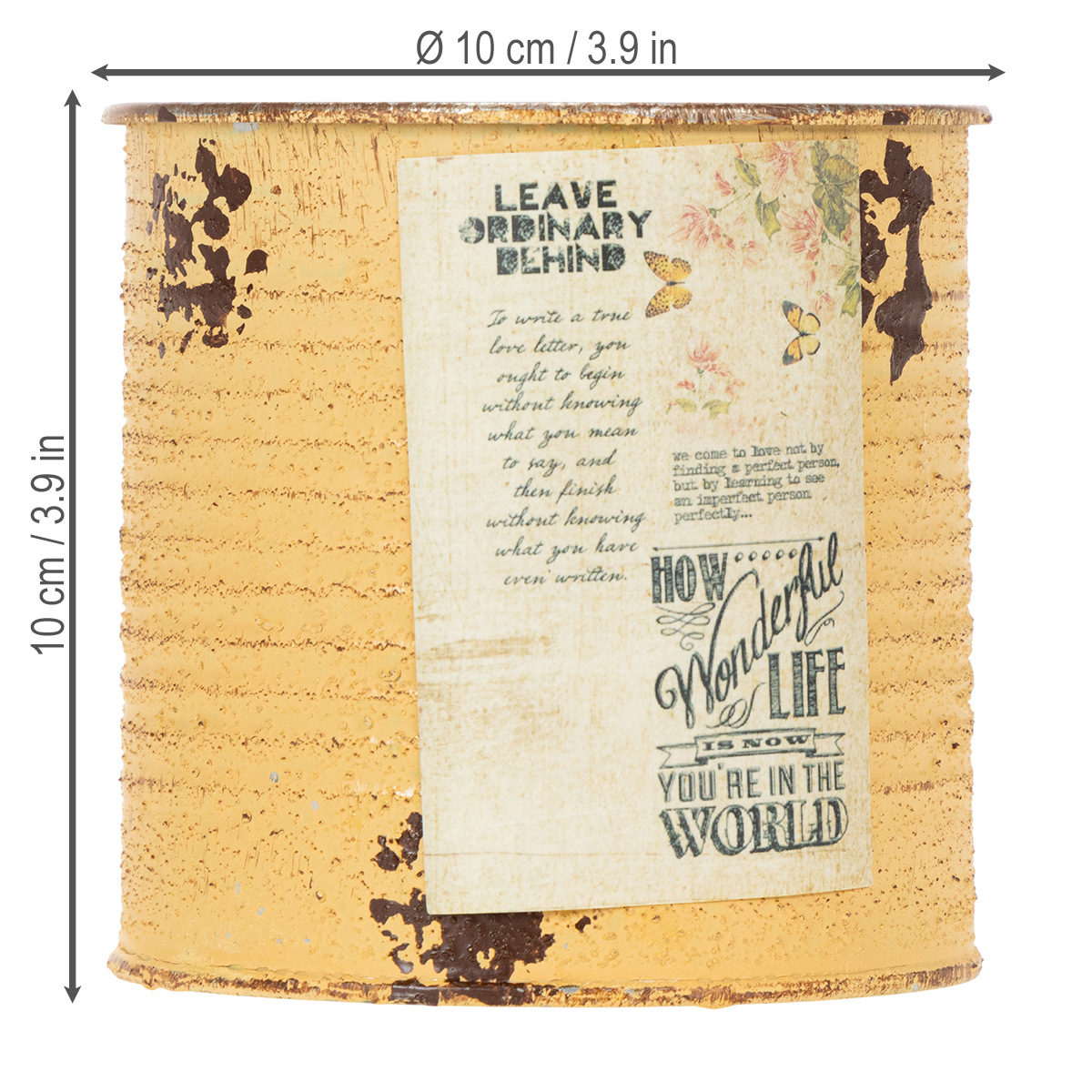¡La lata como lata decorativa en albaricoque es una gran tendencia para las plantas de verano! Clásicamente hecha de metal, la maceta aún muestra el color plateado claro de una lata en el interior. El exterior de la jardinera está pintado en dos colores, óxido y naranja, y además está decorado con manchas de óxido artificiales. Una etiqueta de ensueño y nostalgia completa la decoración vintage de la pequeña maceta de metal. Por supuesto, la maceta de metal tiene bordes lisos en lugar de los bordes afilados de su modelo a seguir. Por lo tanto, también puede usar fácilmente la decoración de lata para manualidades con niños y jardineros.