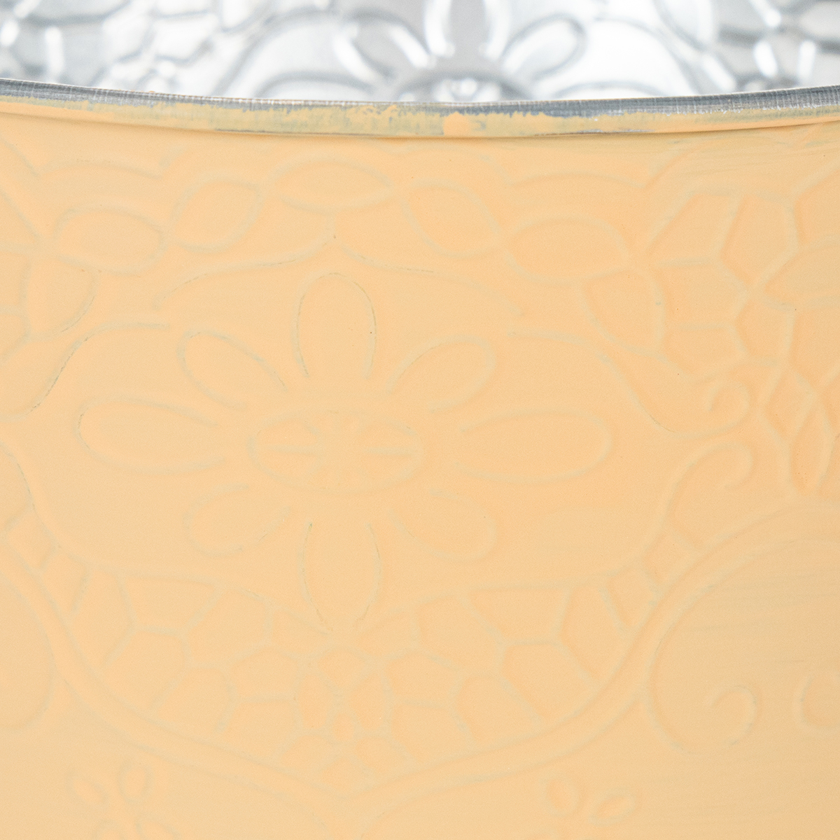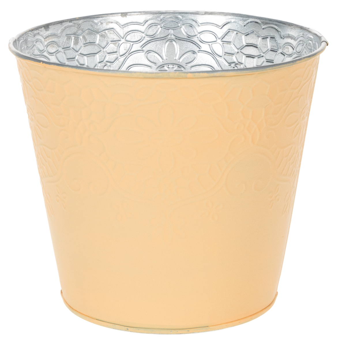 El patrón está grabado en relieve con motivos de zarcillos y flores y se destaca en la maceta. El exterior pintado de naranja contrasta con el interior plateado metalizado sin tratar con la base galvanizada.