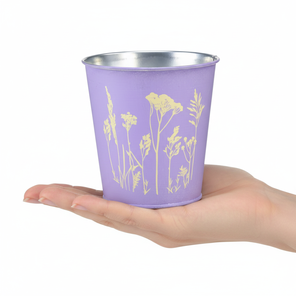 Maceta metálica, jardinera, flores moradas, Ø10cm H10.5cm