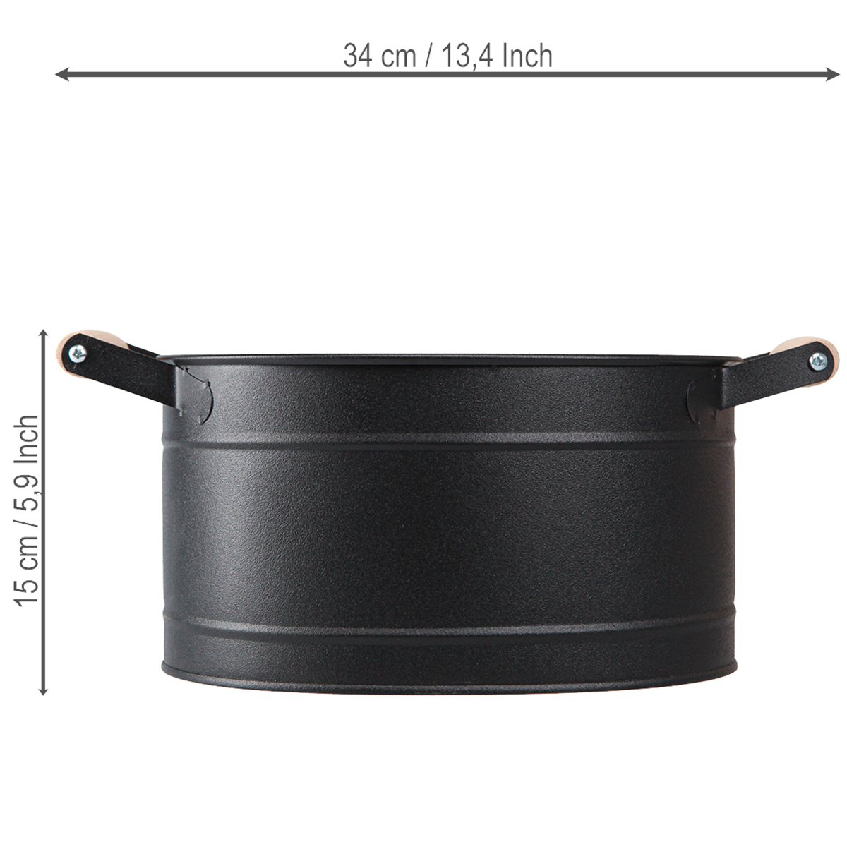 Nuestra maceta de metal en color negro combina un diseño moderno con una gran funcionalidad. El cuenco ovalado convence por su construcción robusta y la elegante combinación de metal negro y mangos de madera natural. Por lo tanto, esta maceta ovalada es ideal para quienes valoran el diseño y la calidad.