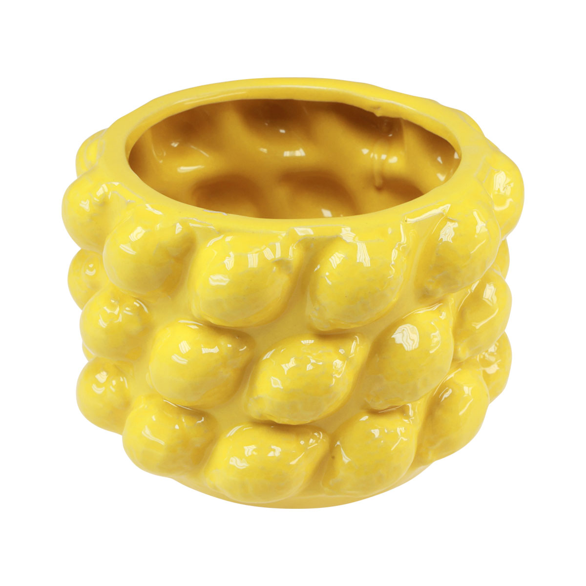 De color amarillo glaseado, este exclusivo jarrón de limón recuerda inmediatamente a los cítricos mediterráneos. El diseño escultural del exterior con muchos limones pequeños le da a la jardinera un aspecto animado.