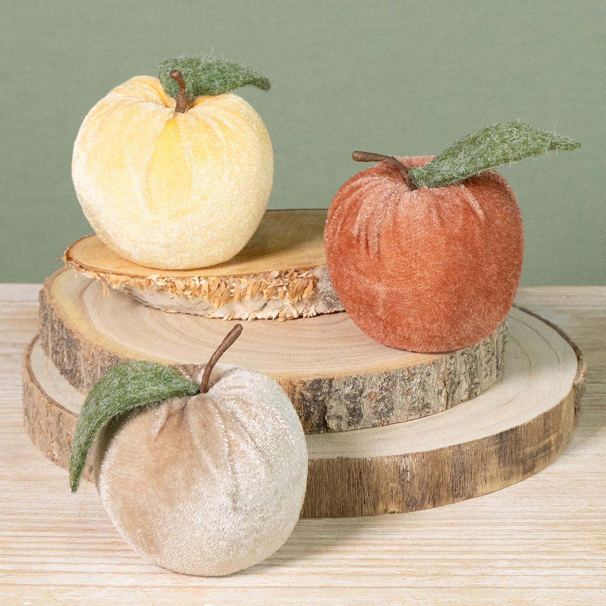 Manzana decorativa de terciopelo con hoja marrón y amarilla, Ø7,5 cm, alto 9 cm, 9 unidades