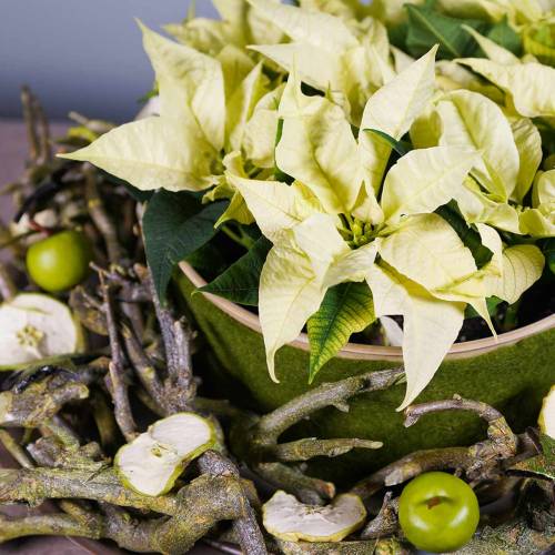 Ya sea para una corona de Adviento o un arreglo de caída: ¡esta mini manzana artificial está unida a un cable de metal flexible y se puede instalar perfectamente en cualquier pieza de trabajo! Simplemente envuelva el alambre alrededor del marco de metal de una almohadilla de corona, alrededor de una rama o un tallo de flores. También puede incorporar las manzanas decorativas en materiales florísticos clásicos como espuma floral, paja y poliestireno. Y gracias al fuerte color verde brillante, las manzanas artificiales armonizan maravillosamente con las manzanas rojas y otras frutas deco, que funcionan particularmente bien como decoración de Acción de Gracias.Por lo tanto, puede usar las mini-manzanas en el cable para una ventana de otoño e incluso adjuntarlas a una guirnalda. Además, los artefactos son una gran decoración para una escuela y un jardín de infantes. Allí también puede jugar con las manzanas mientras elabora manzanas y así crear una hermosa decoración de otoño. ¡Incluso los pequeños arreglos de mesa bonitos para el comedor de su cafetería se ven acogedores y atmosféricos con una manzana artificial verde!