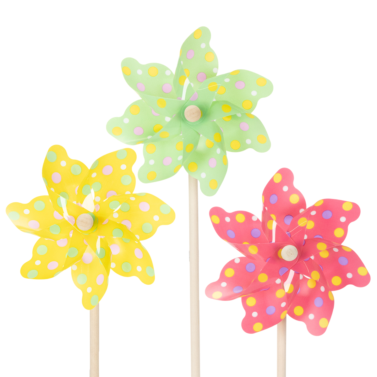 - Colores: Amarillo, verde, rosa, cada uno con lunares.